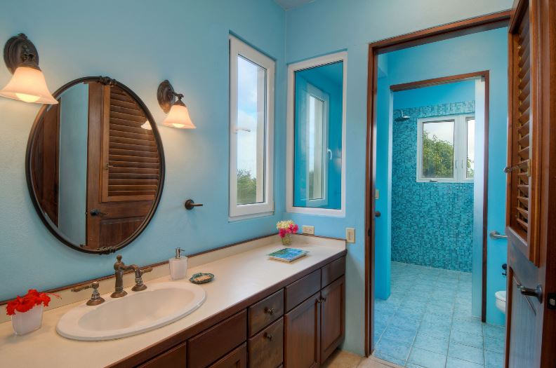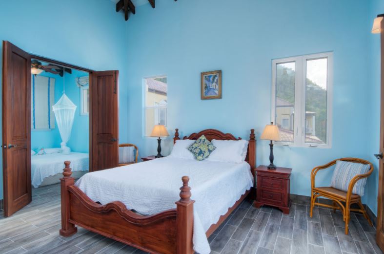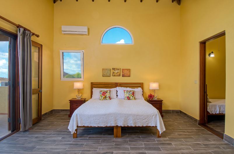 Ariana's bedrooms offer flexibility for guest stays, two bedrooms with en-suite bathrooms. The bedroom on the ground floor has direct deck access, ocean views, walk-in closet & bathroom with shower, ideal for people with limited mobility. The second floor has a larger bedroom with a private balcony, ocean views, walk-in closet, full bathroom with tub & shower, plus an adjoining alcove with a crib for those little ones staying! This bedroom has twin beds if you prefer or can be a king bed otherwise. The Studio has a bedroom with ocean views & adjoins to the living room with writing desk, a powder room & private enclosed stone, outdoor rain shower.
