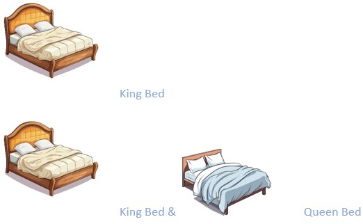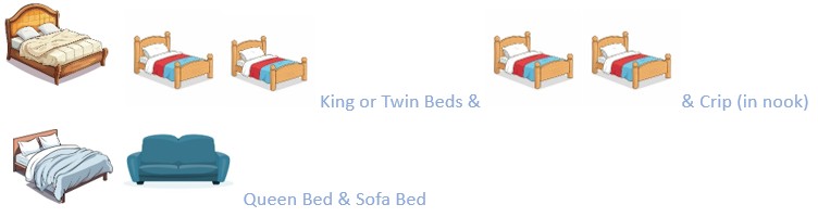 - 4 bedrooms – 2 Twins/King/King/Crib, King, Queen/Sofa Bed, King/Queen. All Air conditioned