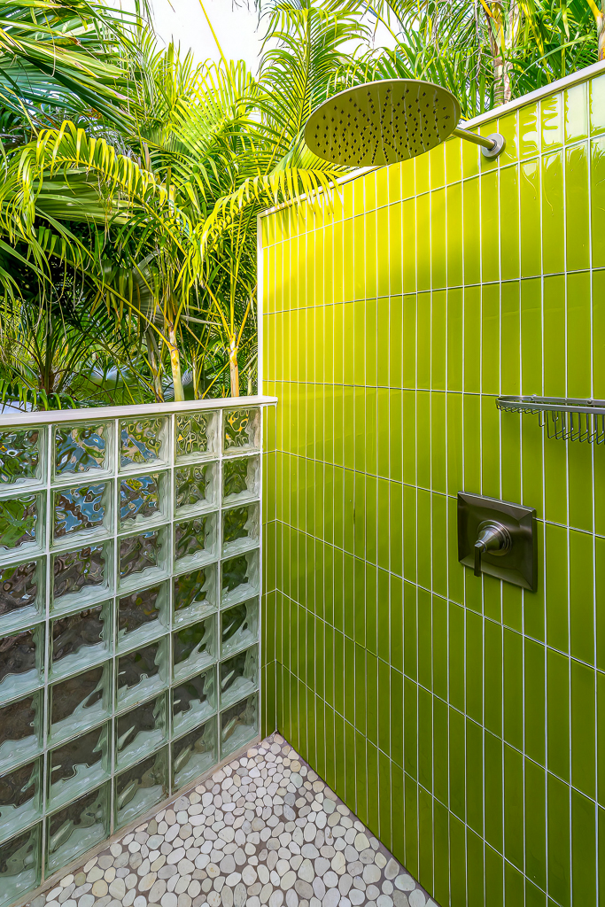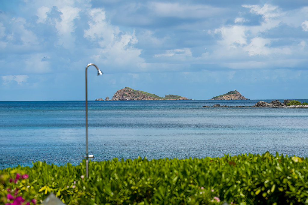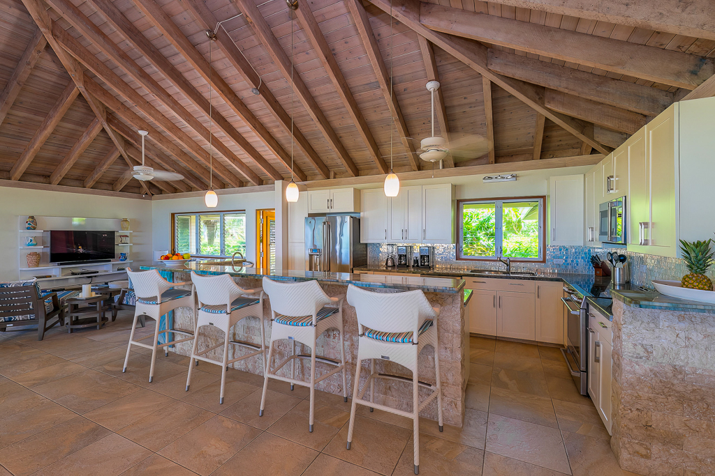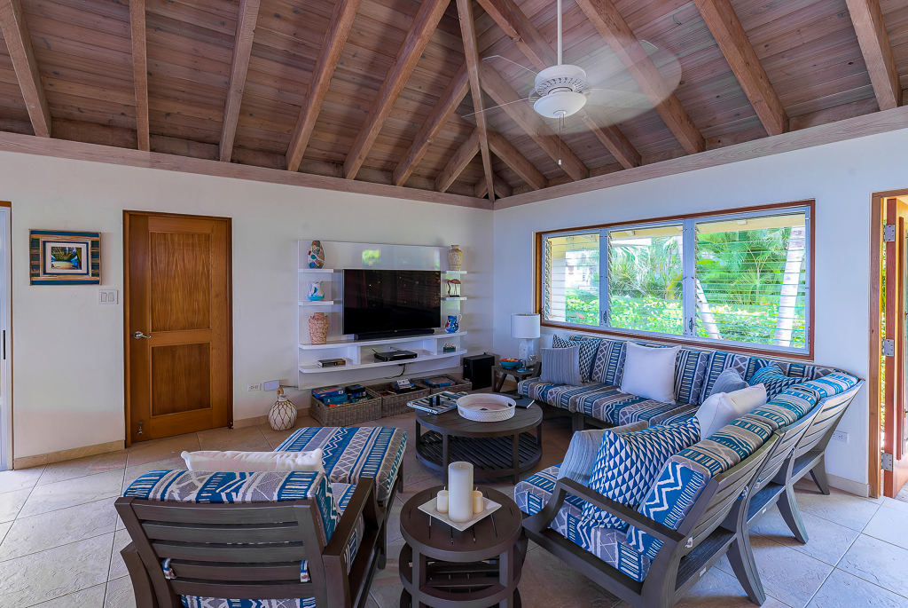 The main pavilion has 2 bedrooms, both with King Beds & en suite bathrooms with outdoor showers. The third bedroom in the main pavilion has 3 Twin Beds with an en suite bathroom. The Great Room is very generous in terms of space & includes a fully equipped kitchen with dining for 12 guests. There is an entertainment centre with satellite TV, DVD player, stereo with iPod docking station. From the Great Room is a covered patio with a dining area & lovely view out to sea.