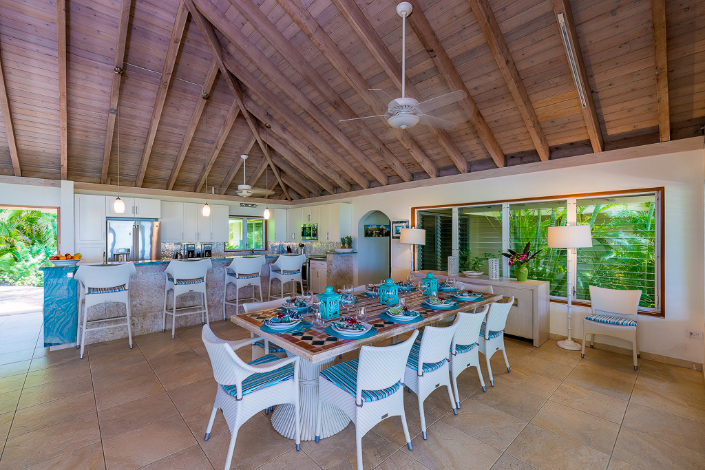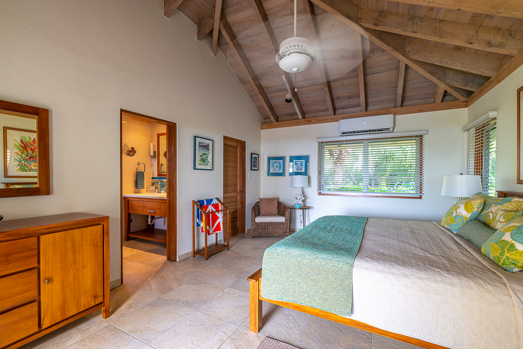 There is a Guest House which is next the main villa, this has one bedroom with a Kind Bed & en suite bathroom with outdoor shower. The bedroom has a fully stocked kitchenette complete with microwave, refrigerator, coffee pot, toaster & blender. Also there is a satellite TV, VCR & telephone. An adjoining en suite bedroom has twin beds & a trundle bed. All bedrooms have ceiling fans & air-conditioning. The villa features comfortable wicker and rattan furniture throughout.