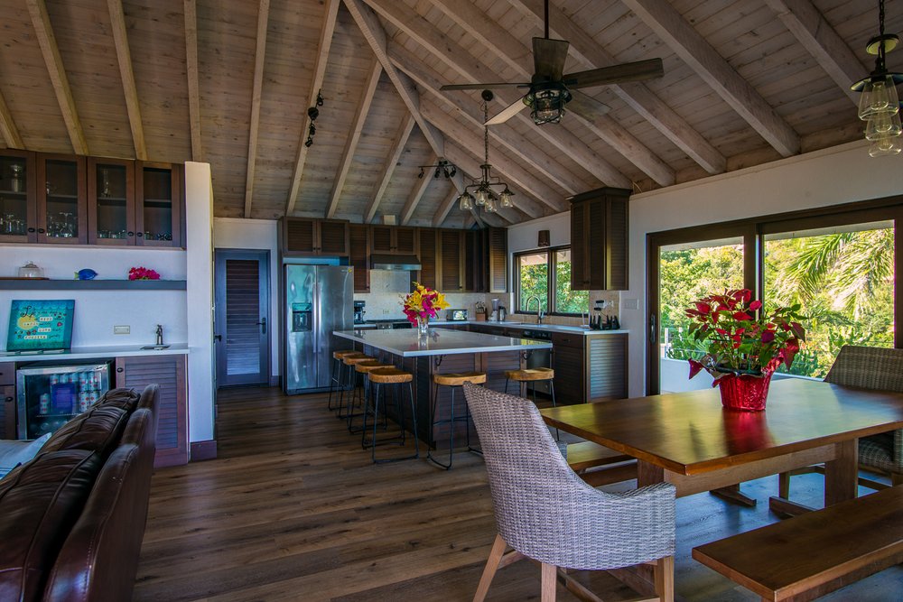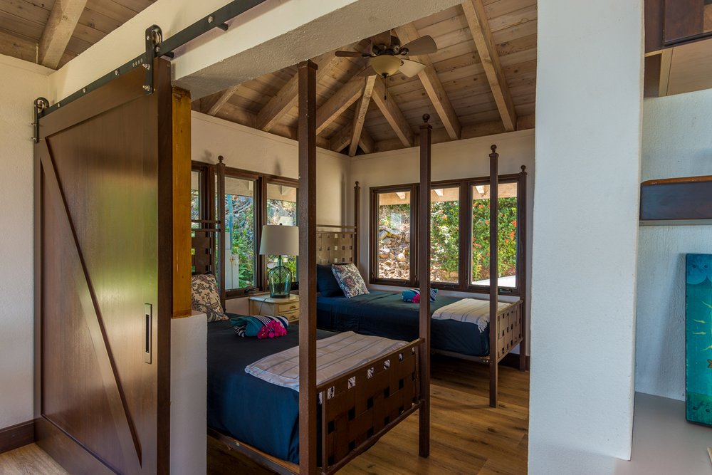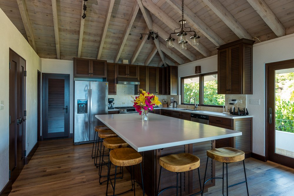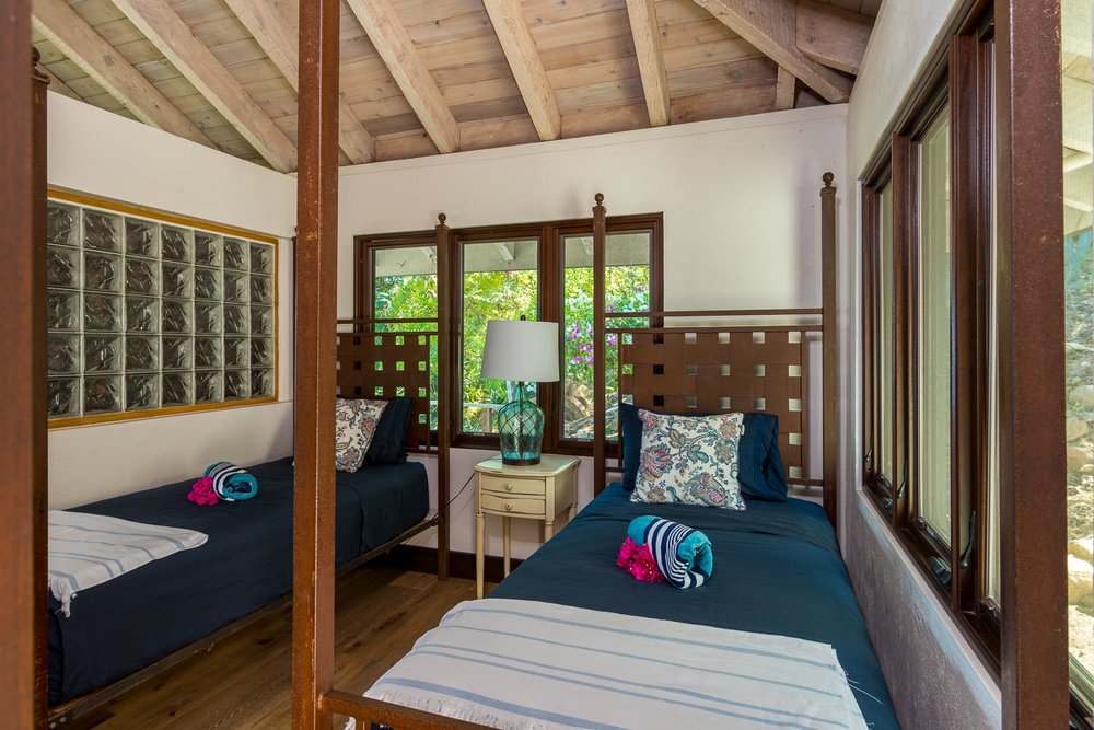 Dos Sols kitchen is well equipped for your needs with dining inside or outside. The 3 pavilion’s all with individual names, surround the freshwater pool & deck. Bedrooms are connected with the main house by natural stone pathways & steps through the garden. The Master suite & second bedroom offer King Beds. Bedroom 3 is a Queen bed, bedroom 4 is twin beds.