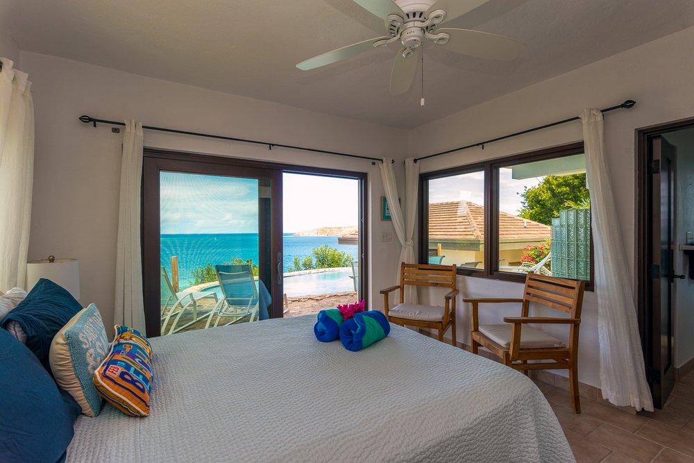 The main house offers a great place to gather with your family or friends during your vacation. The Great Room with its cathedral ceiling & soft furnishings & some local Caribbean art make this a very well appointed space. The 20-foot wall of sliding glass doors opens onto a covered outdoor living or Alfresco dining. North Sound, Prickly Pear Island, Mosquito Island are in the distance, with Anegada beyond. A great place to relax, kick of the flipflops & chill out with a sundowner! The hammock is a nice place to while away a little reading time perhaps, watch the distant lights of Anegada.