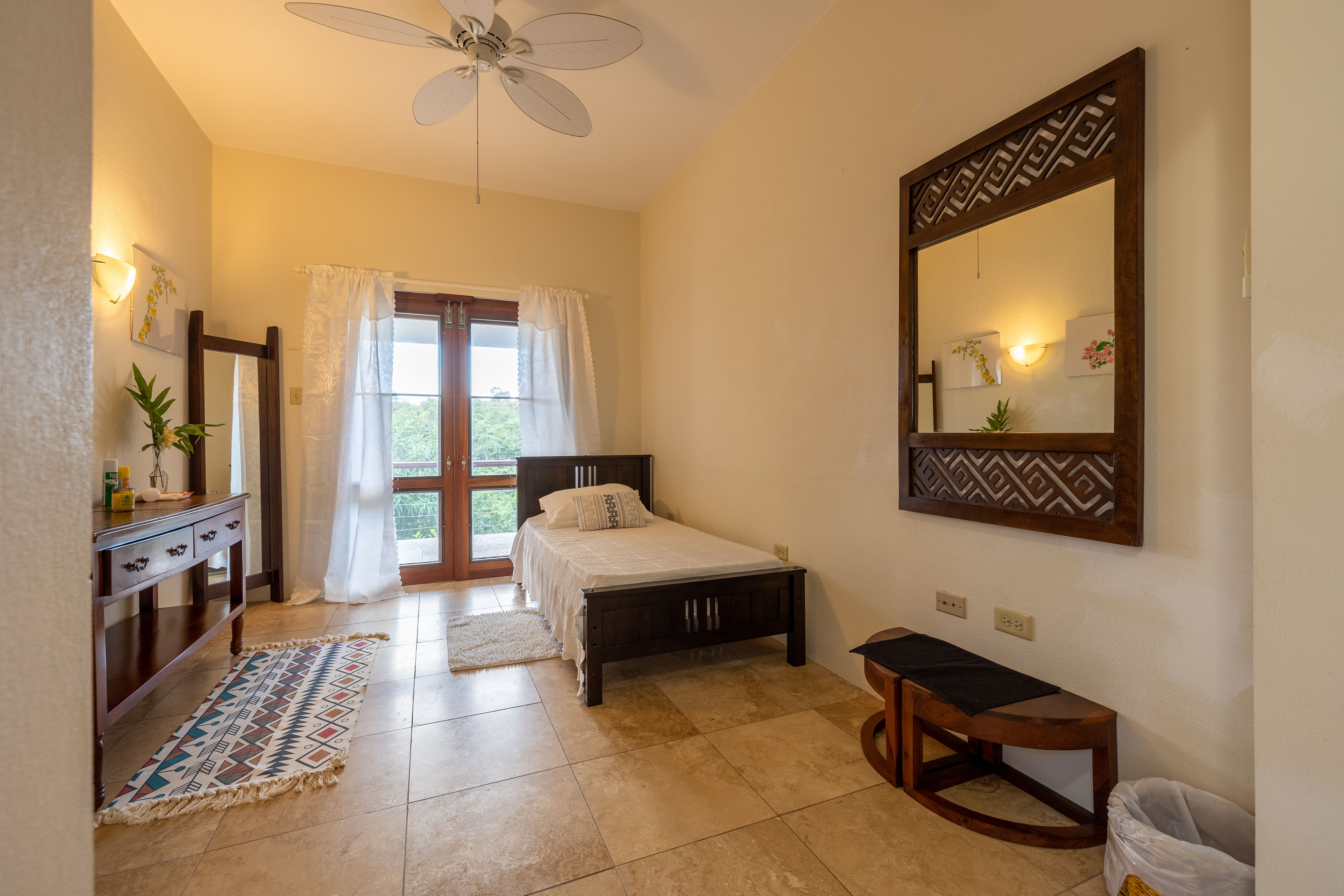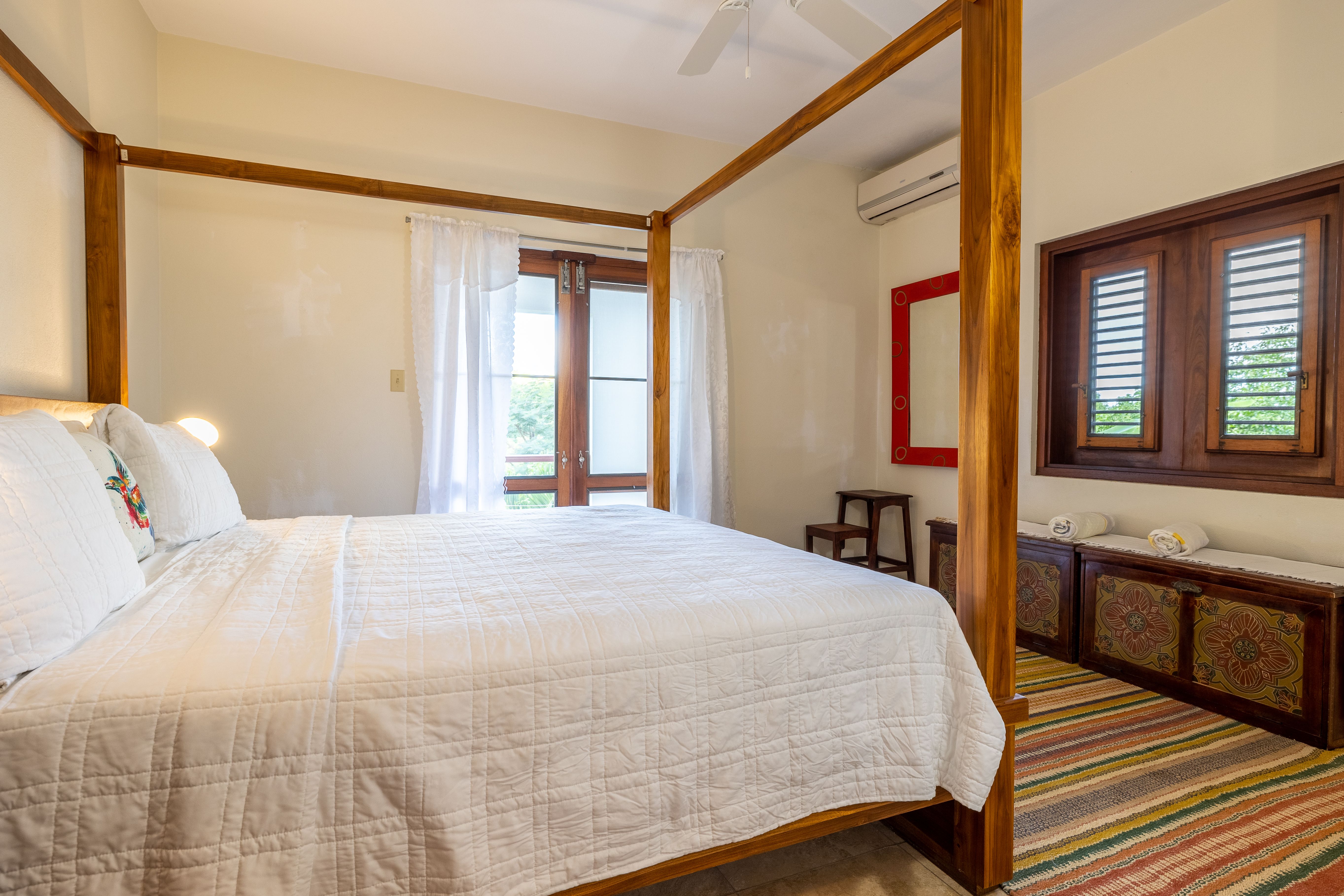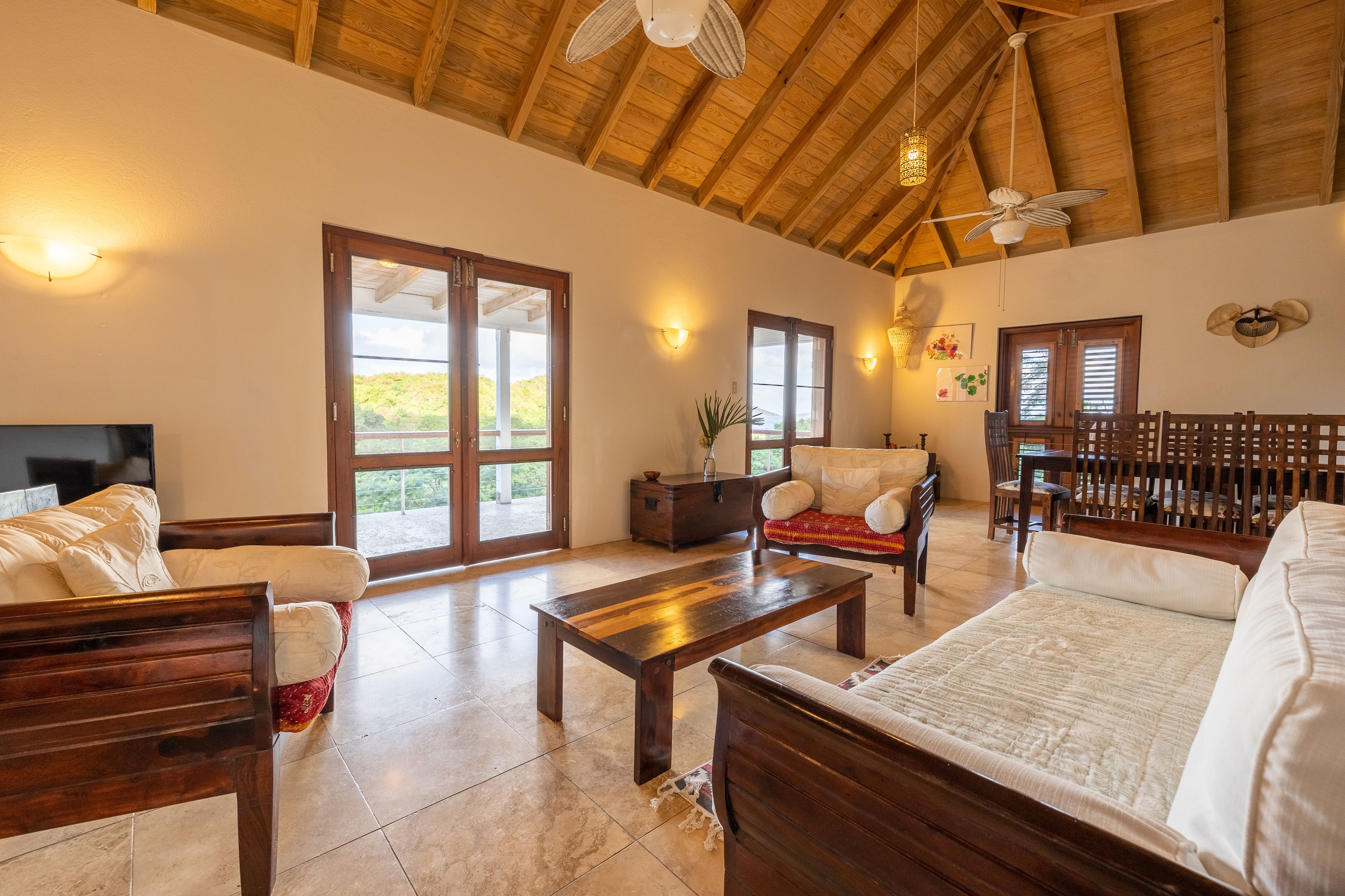 The spacious & elegant living room upstairs has generous seating with beautiful hand-made hardwood furniture. Dining table & chairs for 8, along with a well-equipped kitchen. There is ample cooling from the six ceiling & floor fans to enhance the cross-flow of the ocean breeze. The large verandas on both floors add to the sense of space & feature great views of the lush green hillsides. The sky over the lush Palm Grove and the blue ocean, the islands of Jost Van Dyke, Sandy Spit shimmer in the distance.