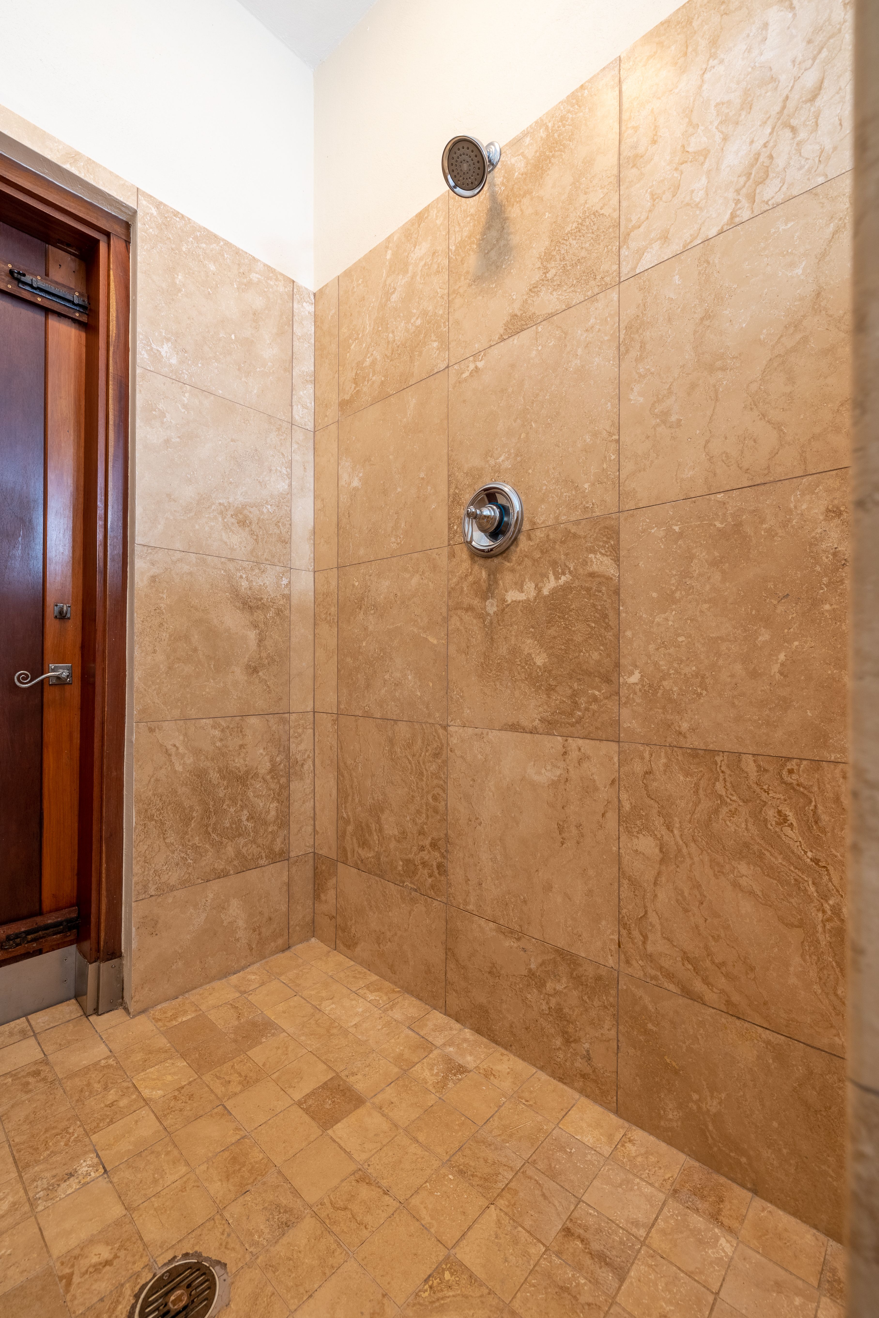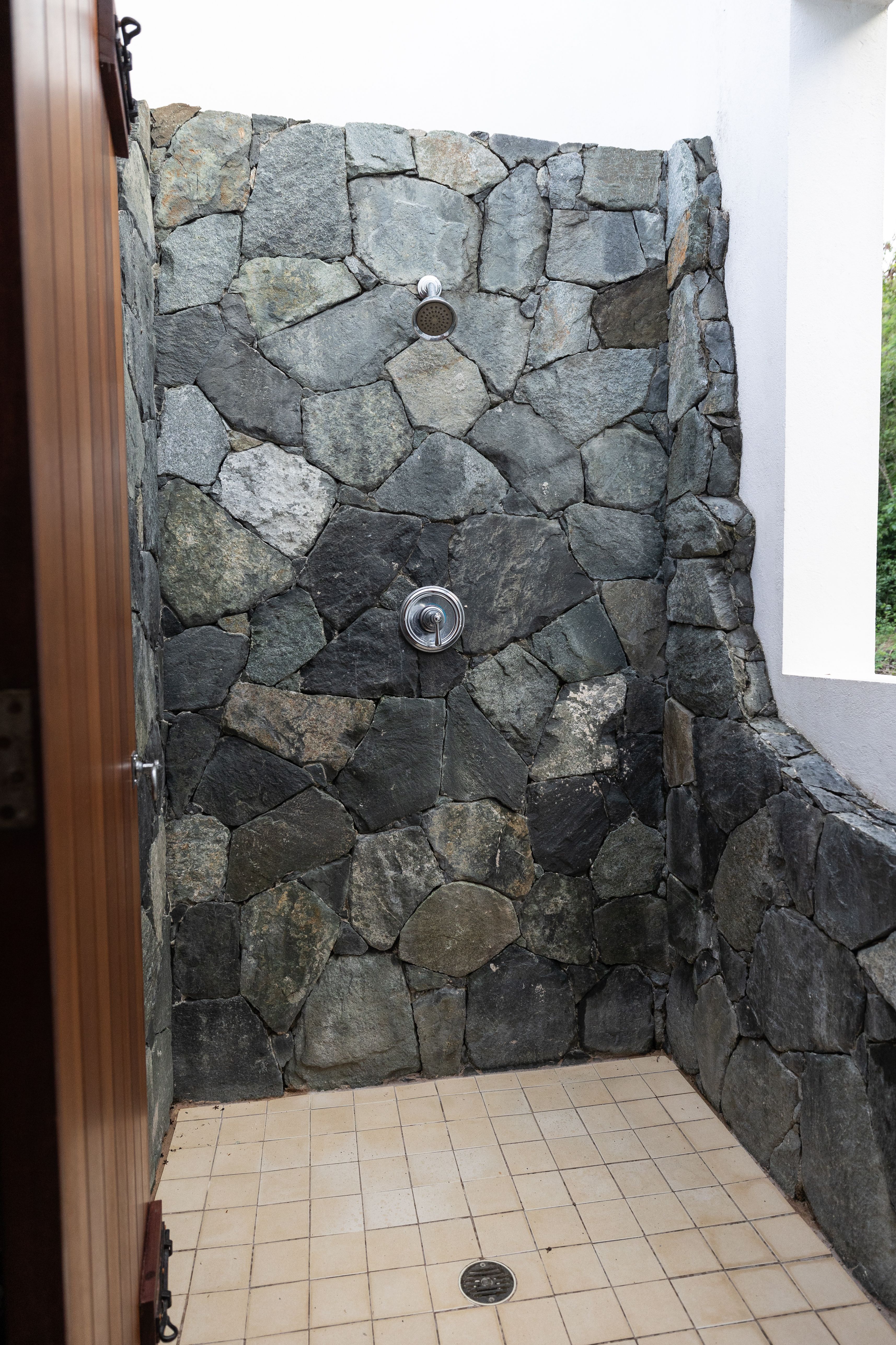 The two air-conditioned ground floor bedrooms provide comfortable Queen & King sized four poster beds with a single bed in the middle room for an additional guest. The main bathroom on the ground floor has double sinks & shower. The mezzanine floor bathroom has a stone clad outdoor shower, adding to the ambience of being in nature.