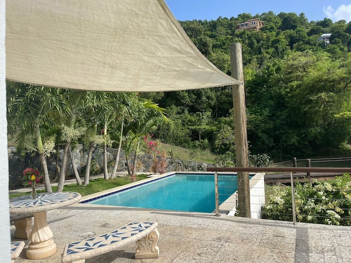 This house is the BEST and at the BEST PRICE!! We had many other friends staying in the area as well that paid far more than we did. The house is PERFECT!! Pool was amazing! the deck upstairs was the best surprise! It's hot here so outside was the best. Great views, nice breeze! I would not walk to Smugglers from here, but it is possible. Best to have a car if you are staying here. Both bedrooms have a great air conditioning. The kitchen has everything you need to save some cash and cook at home. Bring tea! There are chickens and roosters on the property so be prepared to wake up with them. It was nice though- different but enjoyable. Would love to come back with the family some day! Thank you for making this quick getaway the best!