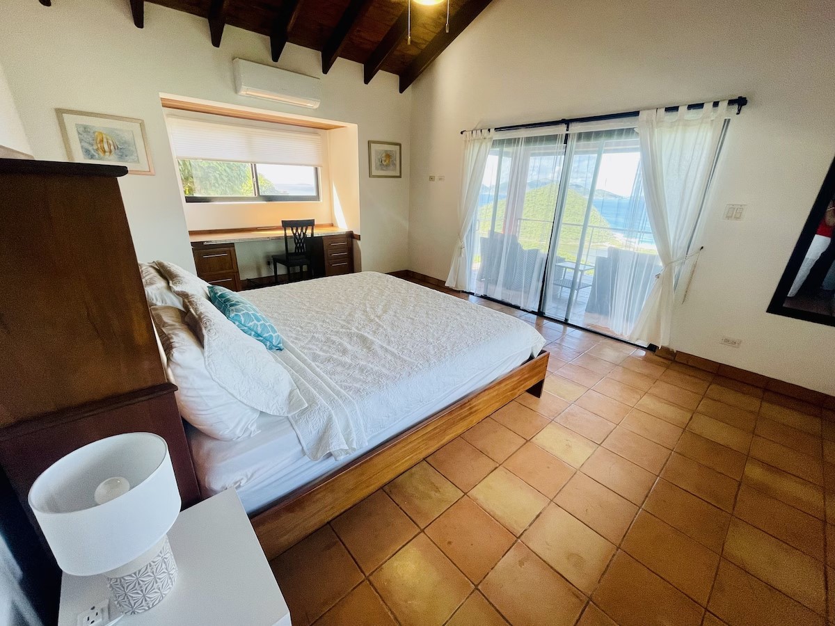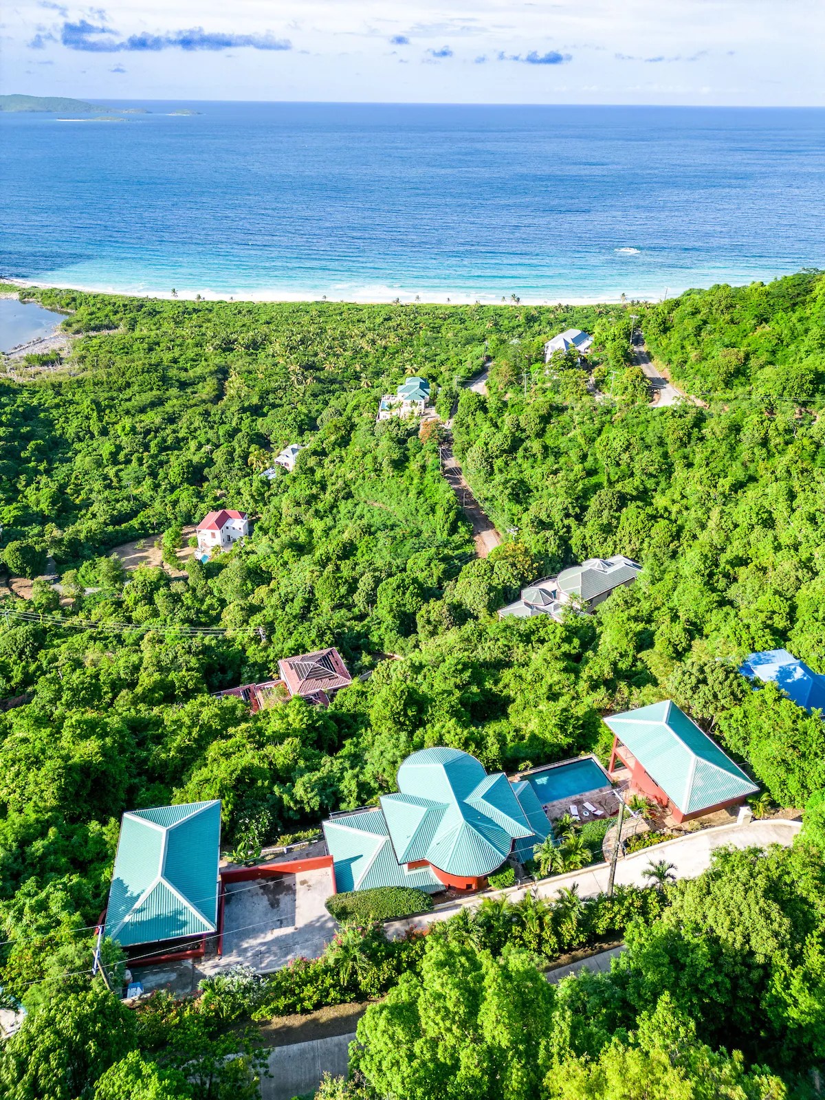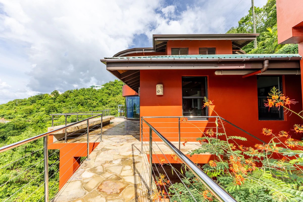 The villa is built into the gently sloping hill which makes full use of this elevated position. The wide, sweeping coastline of the island, green tropical terrain & majestic ocean awaits. The villa has parking at the rear of the property. There are two levels to this villa with large glass doors & windows to enjoy the vista. There is a large terrace with a series of paved pathways & steps that interconnect the various levels of the property.