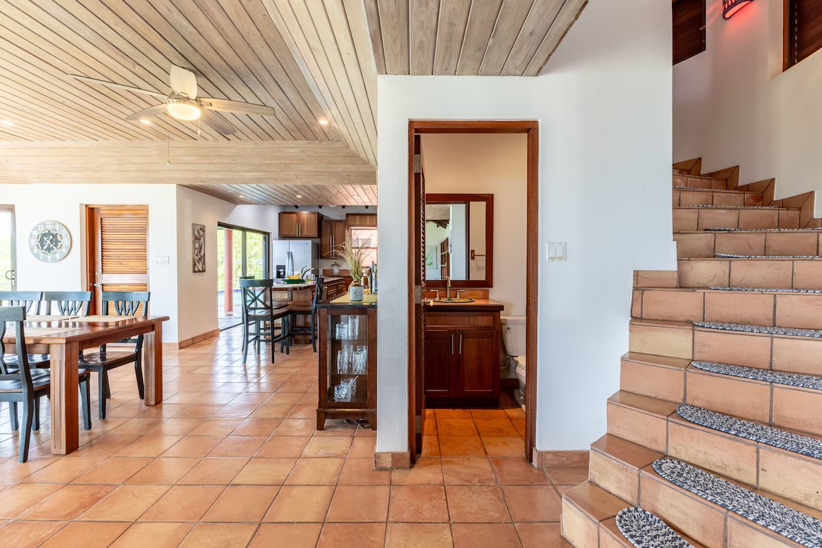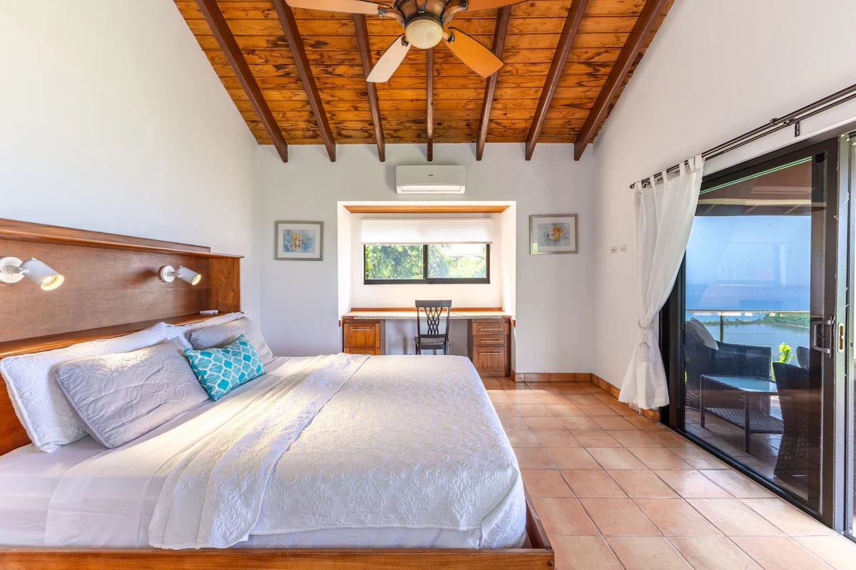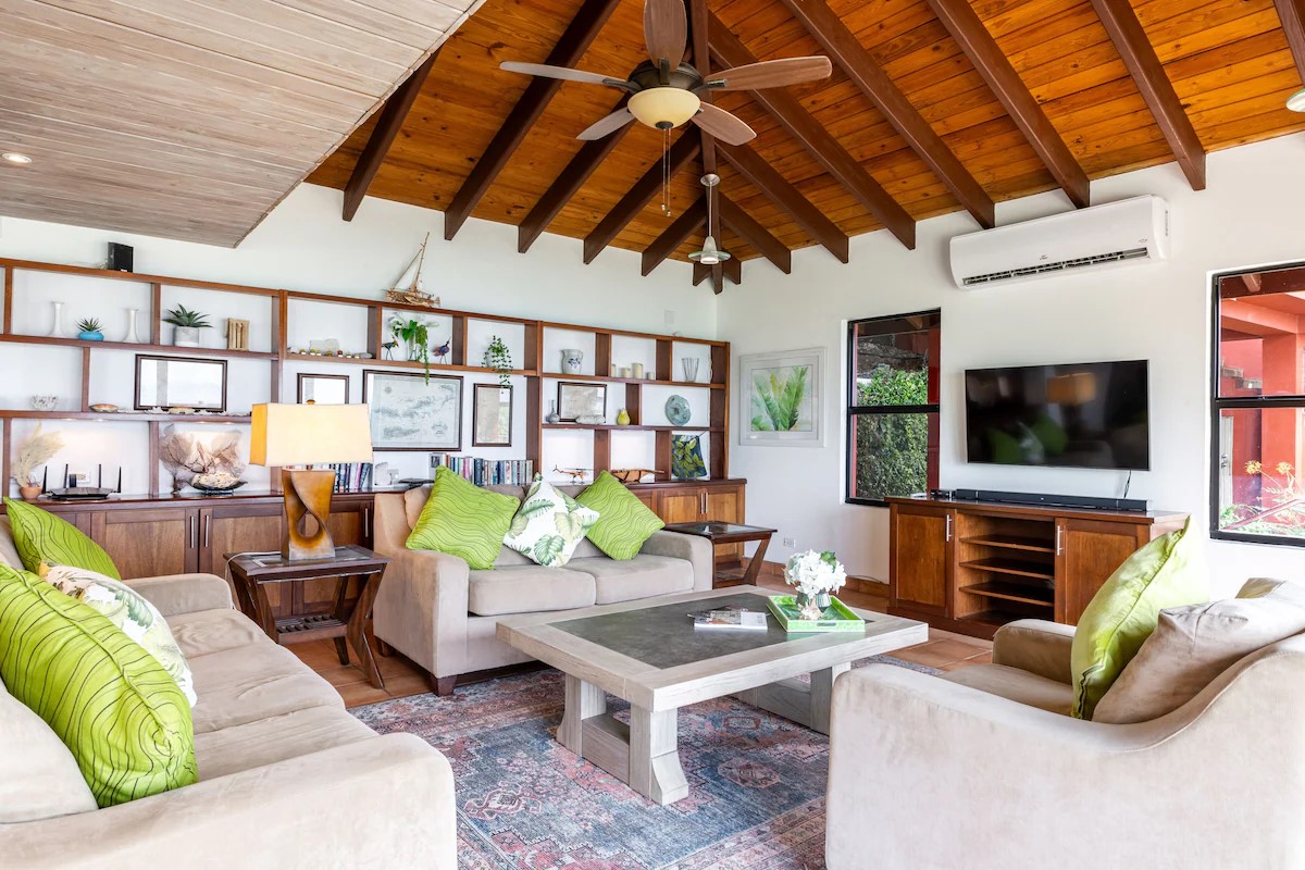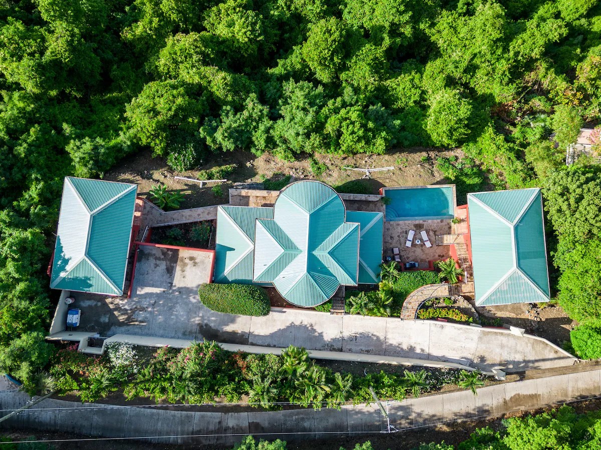 The villa is built into the gently sloping hill which makes full use of this elevated position. The wide, sweeping coastline of the island, green tropical terrain & majestic ocean awaits. The villa has parking at the rear of the property. There are two levels to this villa with large glass doors & windows to enjoy the vista. There is a large terrace with a series of paved pathways & steps that interconnect the various levels of the property.