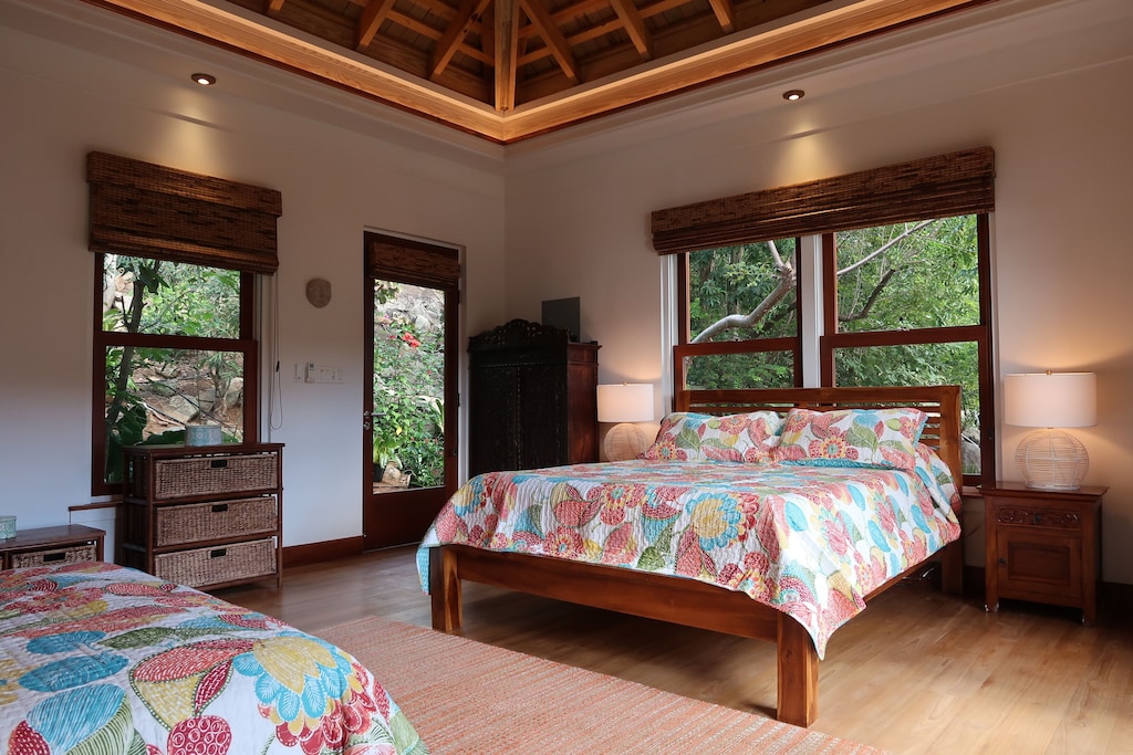 Parvati has many indoor & outdoor sitting areas. The sun & pool decks run the entire length of the villa. Lots of gardens to sit & read, listen to some music. The sitting room/TV lounge opens out to the pool deck. Alfresco dining is at the centre of the villa, so you can enjoy plenty of family time. There is a BBQ, full kitchen with all the latest appliances to help you create a lovely dinner perhaps or breakfast for your family or friends. Parvati has four air-conditioned bedrooms is luxuriously furnished & equipped with en-suite bathrooms.