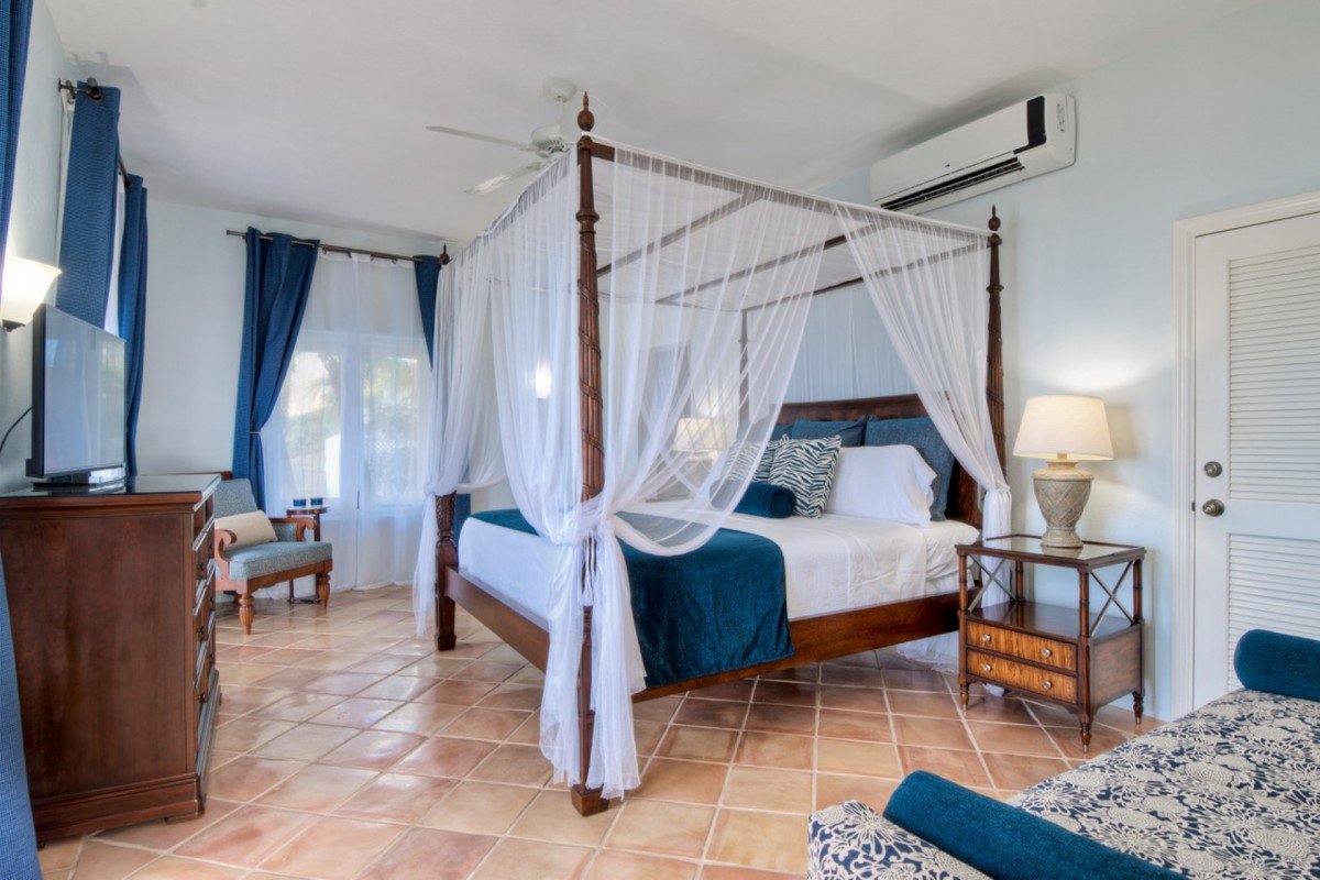There are two separate pavilions positioned either side of the pool. The main pavilion has the kitchen, living room which opens out onto three veranda’s to enjoy several views of the island. The vaulted ceiling’s offer a relaxing experience with many sofas to enjoy the ambience and entertainment of this villa. Indoor dining offers you a chance to dine more elegantly with its glass top table and majestic chairs. The large kitchen is well-equipped and offers you a home from home experience to ensure you can cater for you and your guests needs.