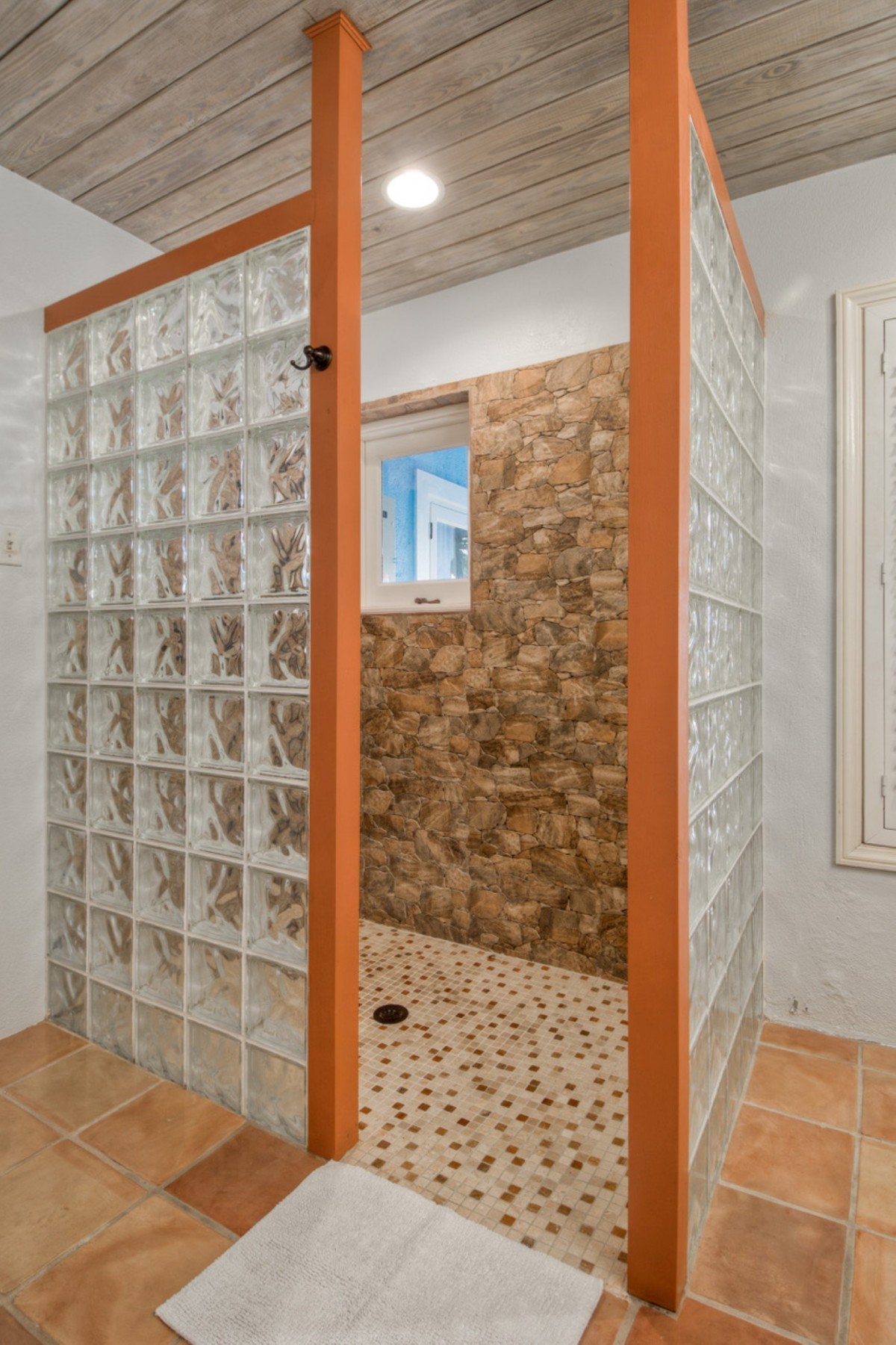 At the front of the main pavilion is a lower level bedroom with 4-poster bed and en suite bathroom. There is a large shower and also enjoys a full kitchen which makes it a private suite from the rest of the house. At the rear of the deck on the lower floor is a bathroom with two further bedroom/bathroom suites on the upper floor, a King Bed or Twin Beds if you require this layout. The next two bedrooms/bathrooms (one has a bath tub) are one above the other and in a separate pavilion leading off the pool deck. The layout of this villa allow privacy for all its guests. The views from these bedrooms are stunning from their private verandas.
