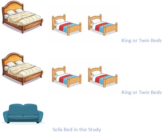 - Bedrooms (3 x King, 2 x twin/king 1 x queen in study)