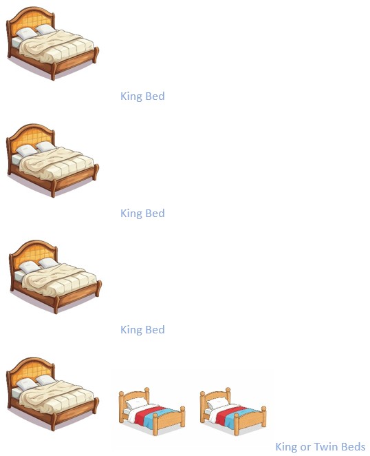 - Air Conditioned bedrooms, King/Twin, Beachfront Pavilion King, Rear Guest Pavilion King, Bathrooms/Alfresco showers