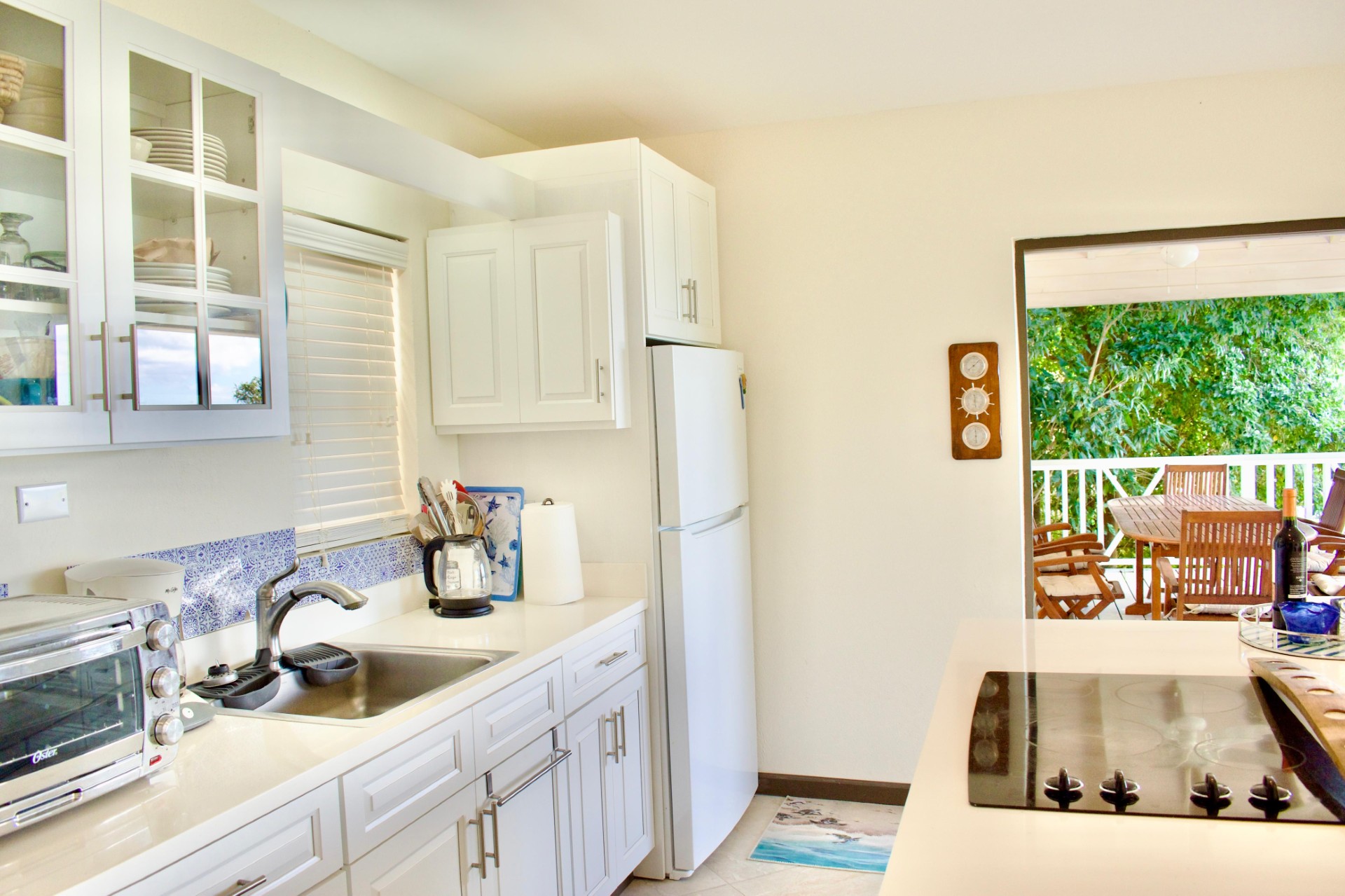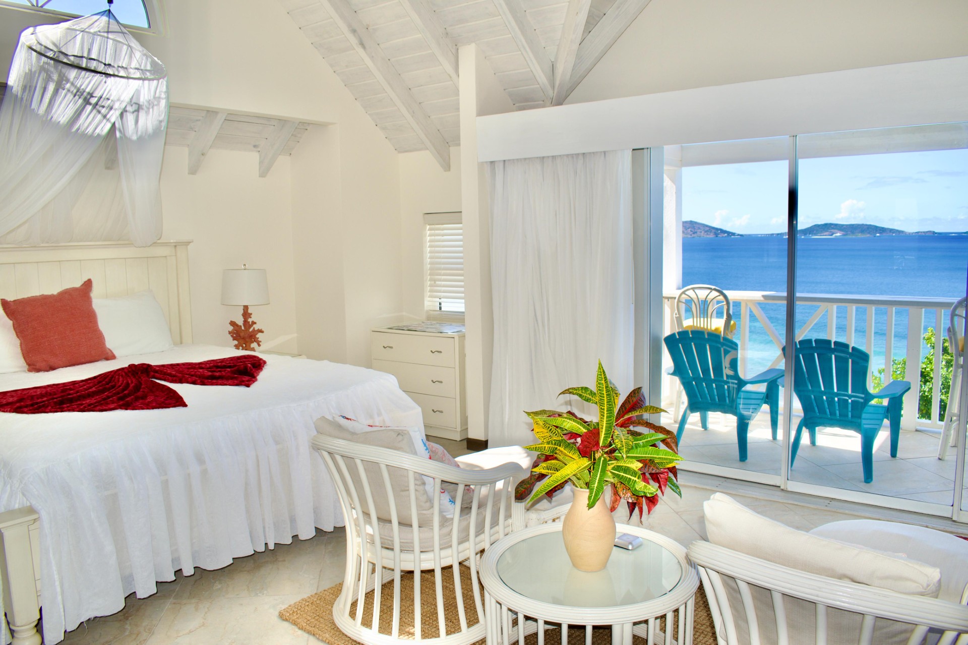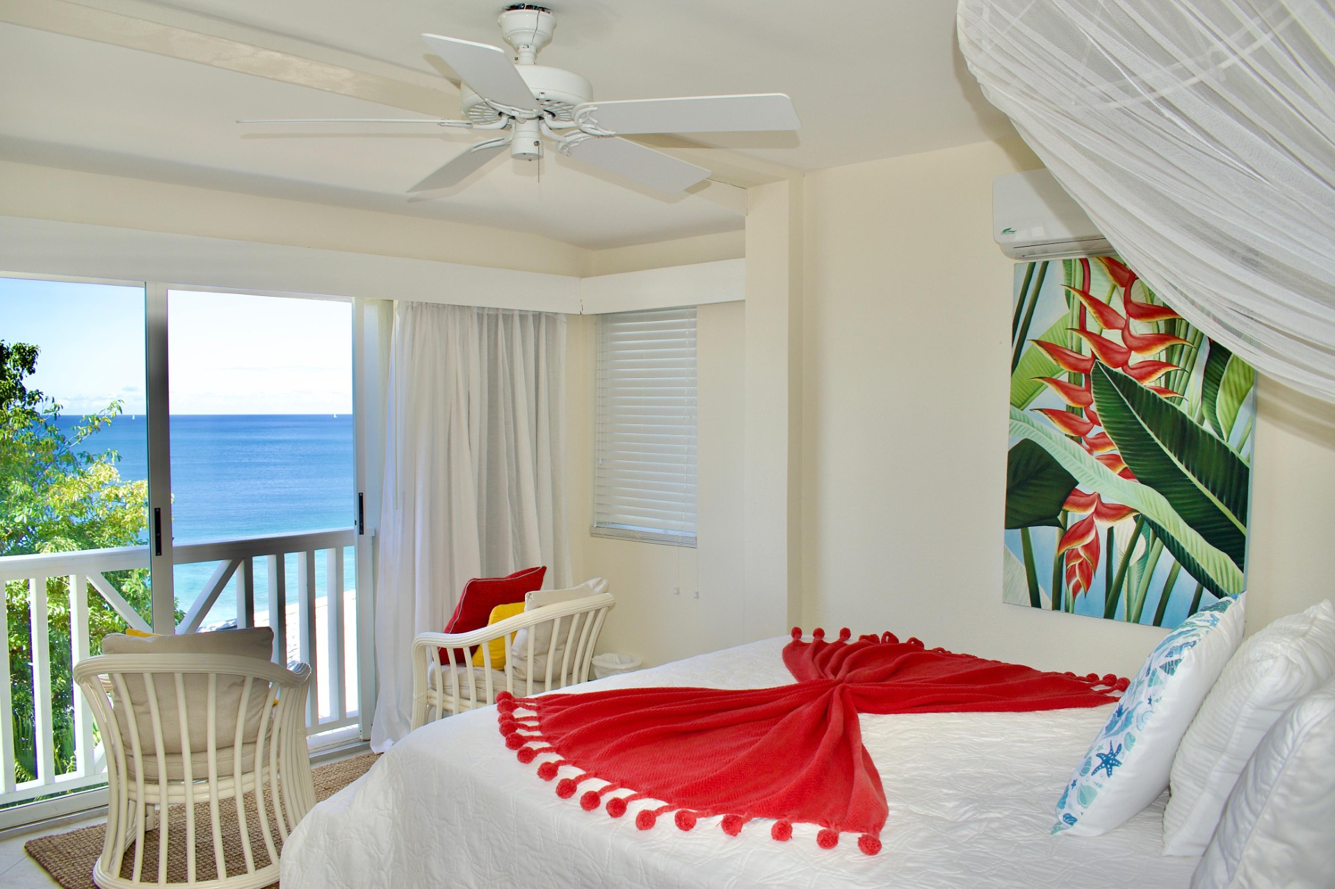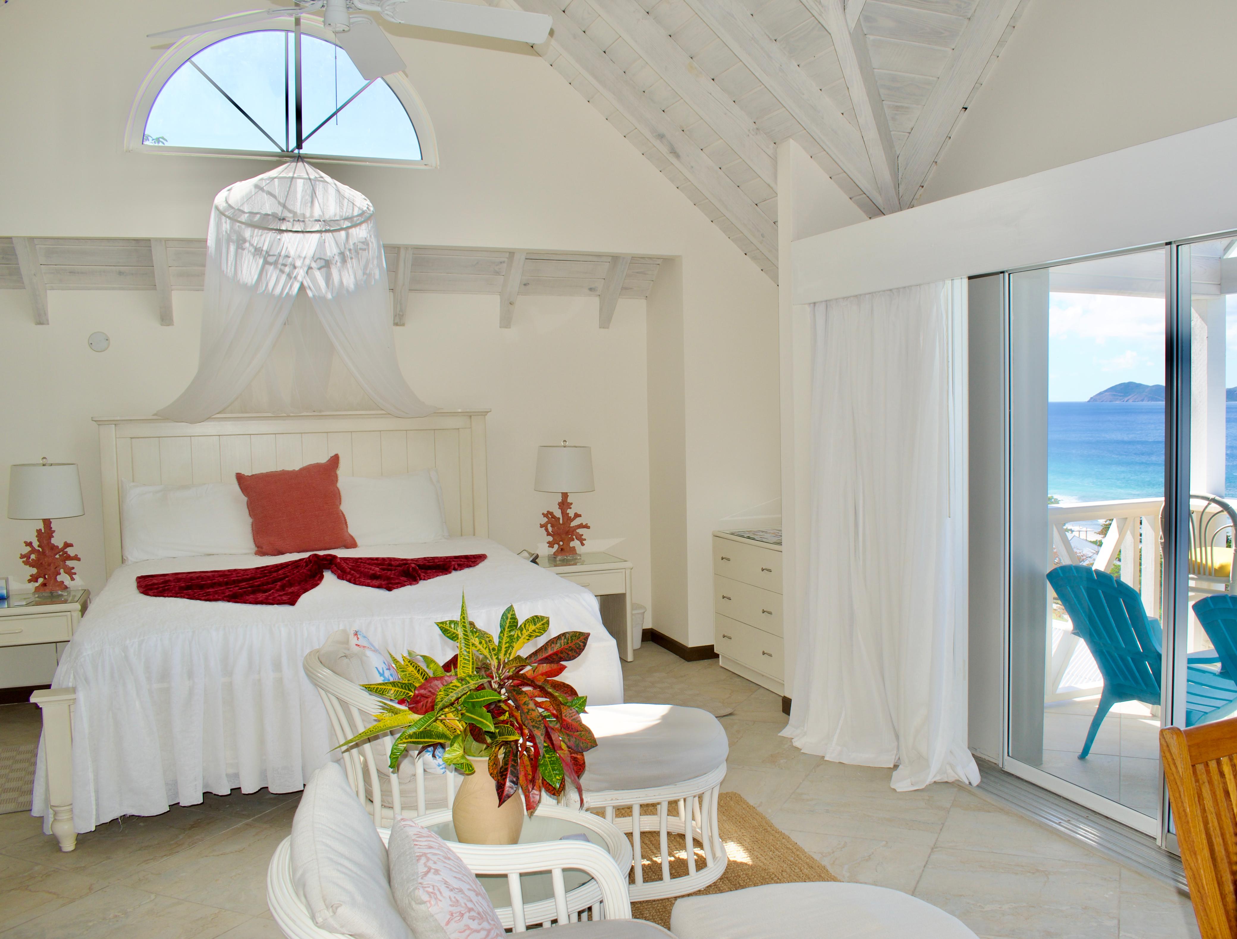 Seaview Villa 37 enjoys two self-contained suites on separate levels. The Penthouse has a King Bed & stunning view of the Long Bay Village & Long Bay Beach. The Garden Suite has a Queen Bed, both with en-suite bathrooms.