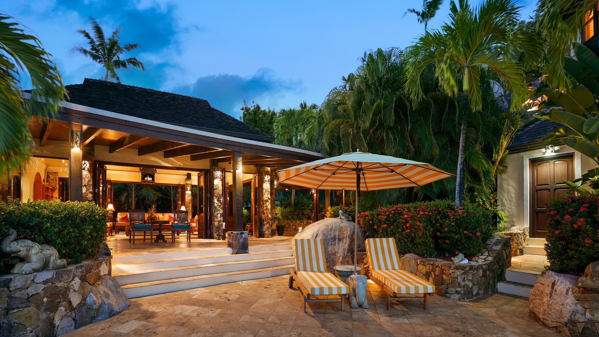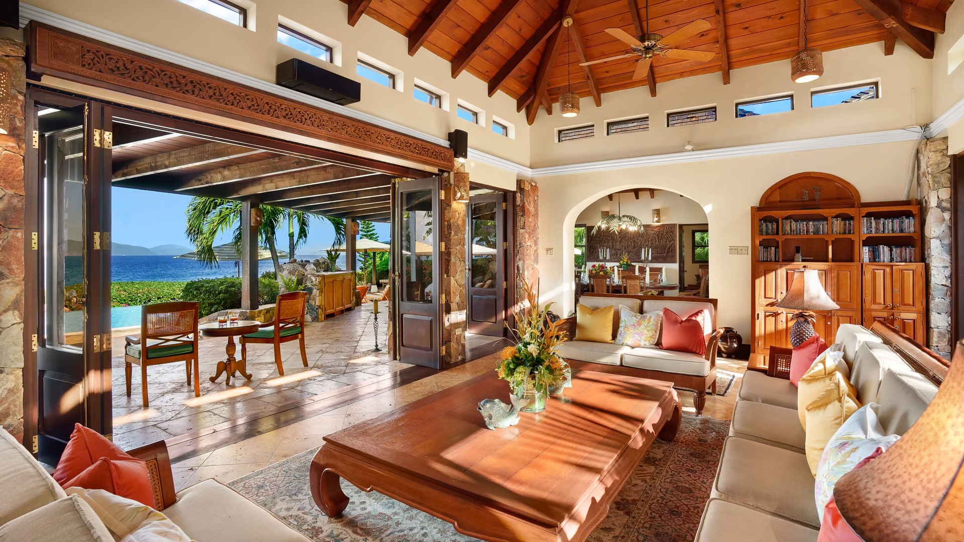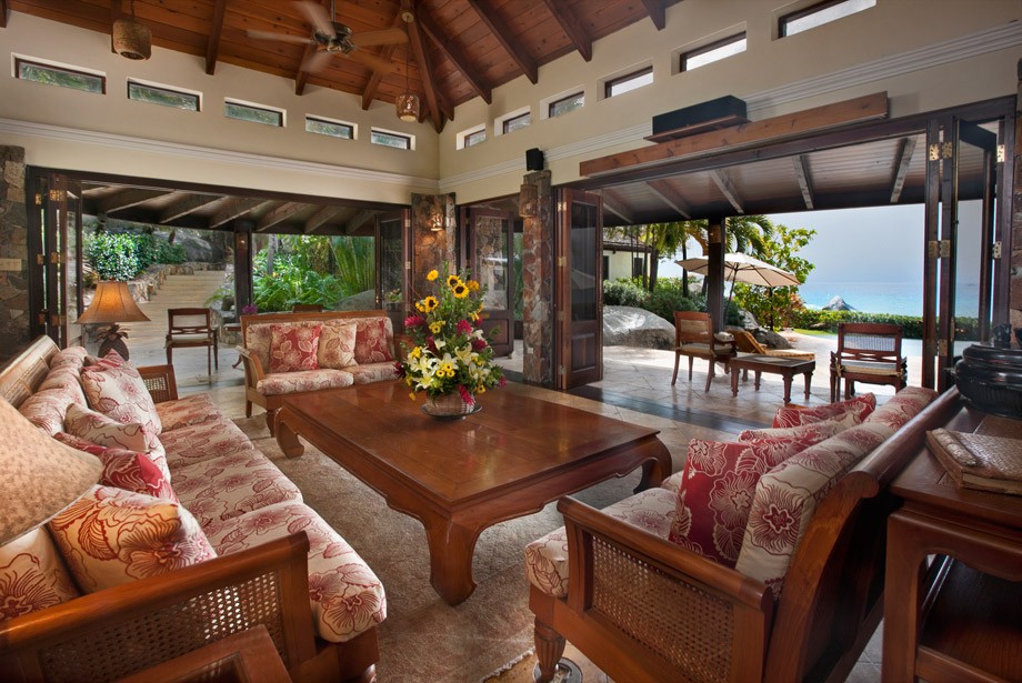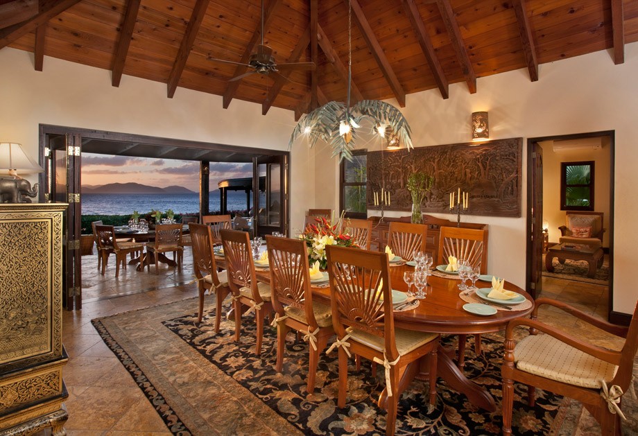 The gardens have palm trees as you enter through the majestic carved Indonesian gate. Your met by the infinity-edge pool & delightful ocean ahead. The Main Pavilion includes a large terrace with outdoor dining, the Great Room with its elegant dining room, gourmet kitchen & office. The Great Room offers a good place to meet up as a family or group of friends. There is even a home theatre system for you to enjoy a movie night perhaps! If you prefer to eat in the dining room can seat up to 12 guests. The kitchen is well equipped with a Viking range, Sub-Zero refrigerator, wine chiller, icemaker & Jura Expresso Machine.