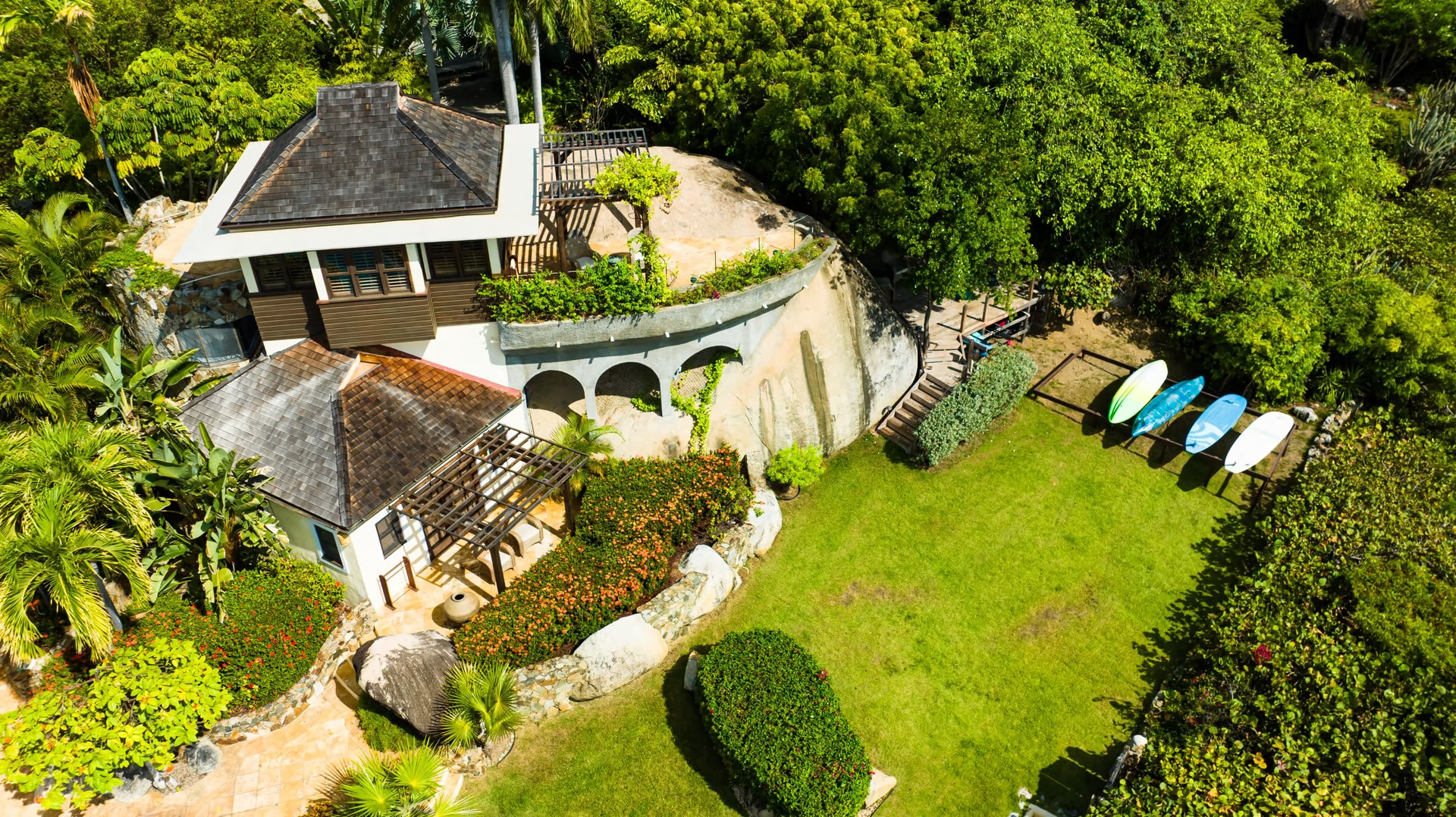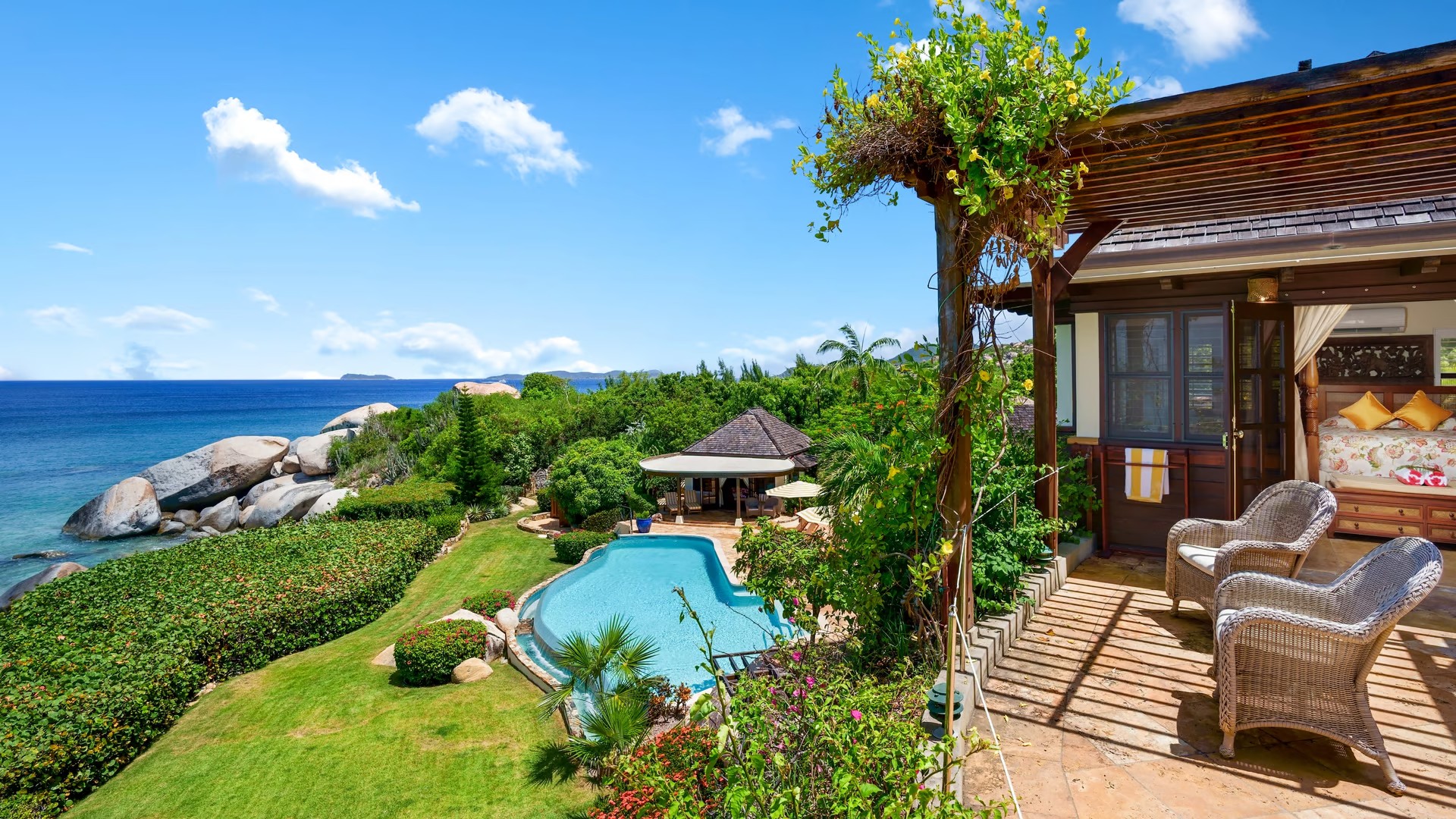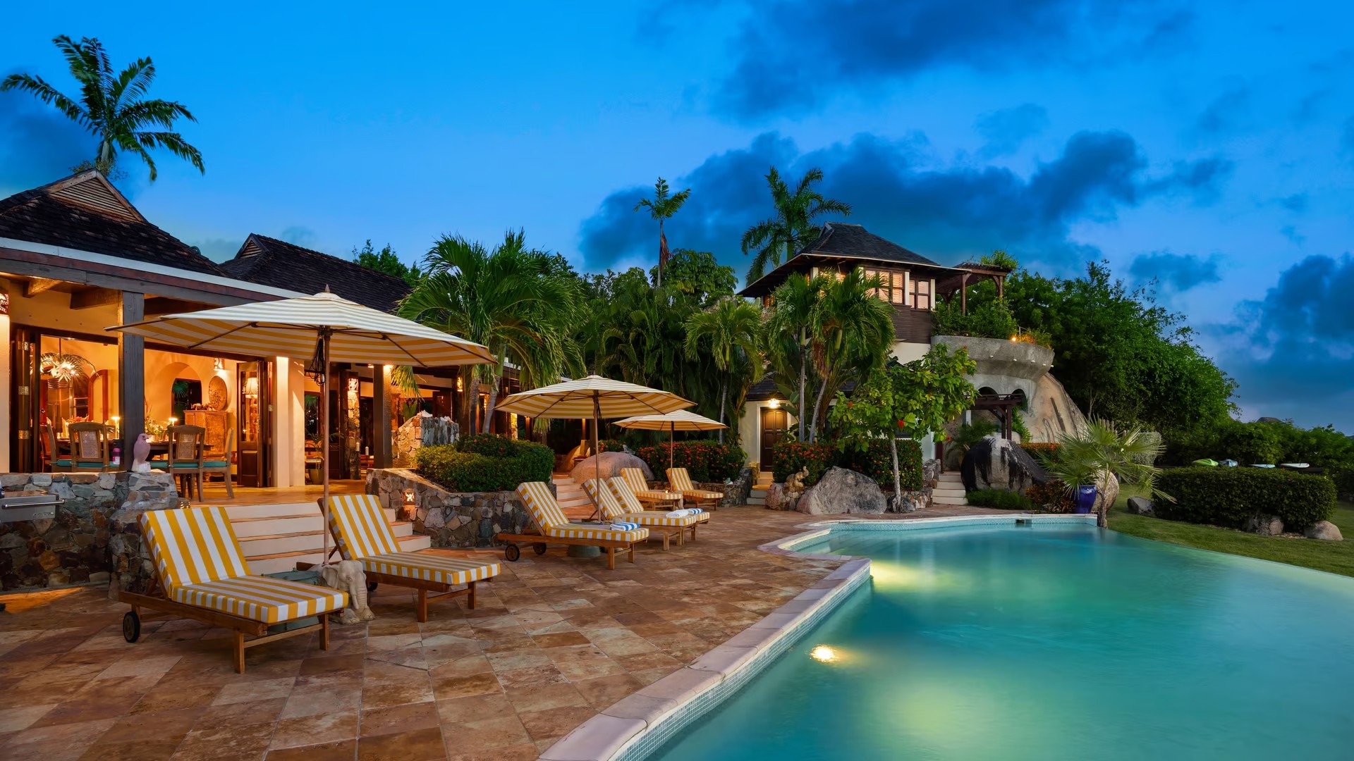 The gardens have palm trees as you enter through the majestic carved Indonesian gate. Your met by the infinity-edge pool & delightful ocean ahead. The Main Pavilion includes a large terrace with outdoor dining, the Great Room with its elegant dining room, gourmet kitchen & office. The Great Room offers a good place to meet up as a family or group of friends. There is even a home theatre system for you to enjoy a movie night perhaps! If you prefer to eat in the dining room can seat up to 12 guests. The kitchen is well equipped with a Viking range, Sub-Zero refrigerator, wine chiller, icemaker & Jura Expresso Machine.
