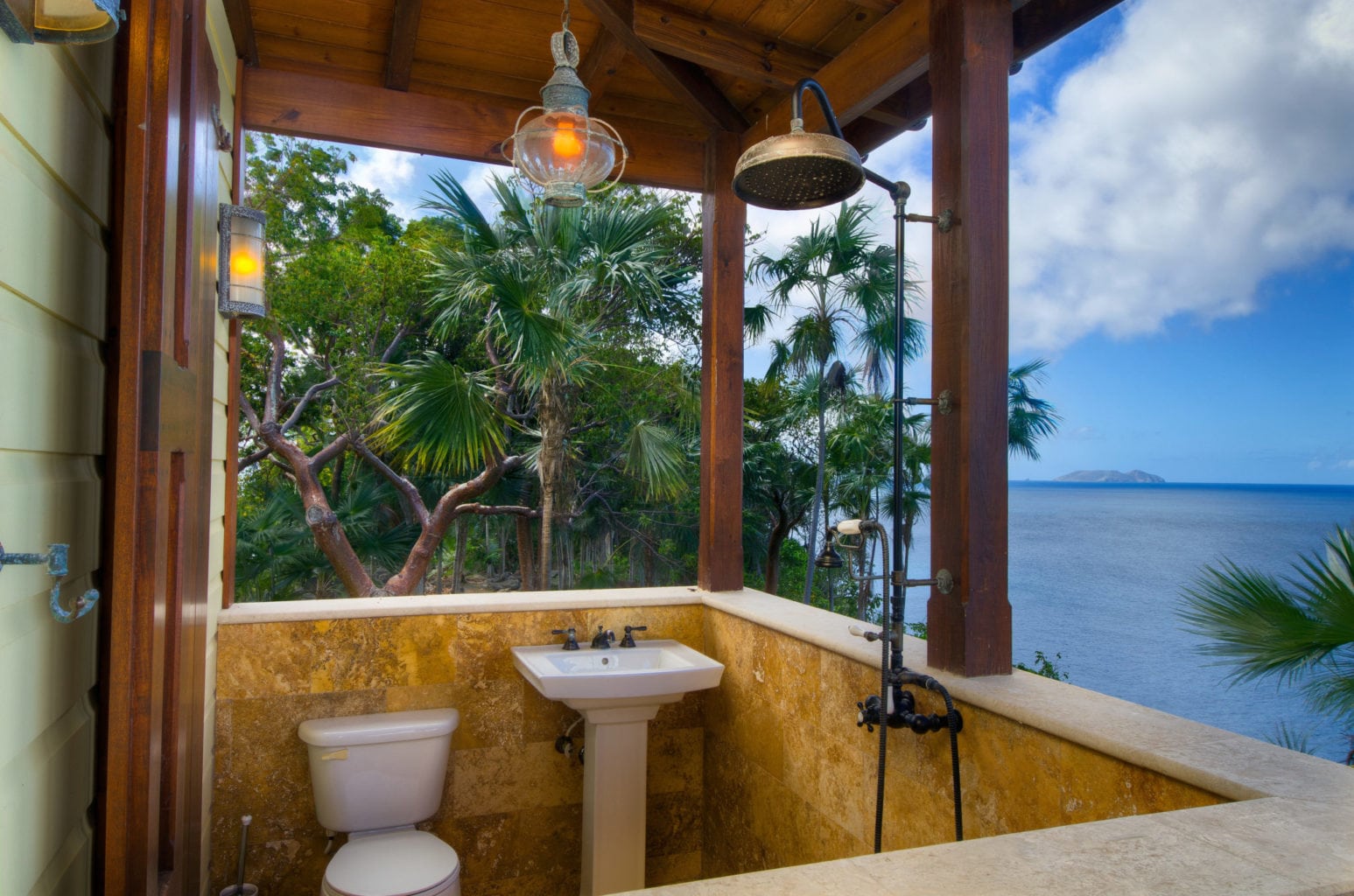 The great room, kitchen, a bedroom, outdoor bathroom & wraparound deck are on the upper level of this house layout. The lower level offers a privately-accessed bedroom suite, indoor bathroom & wraparound deck along with a private pool. Lovely grand doors open out onto the ocean with wonderful views of the entry of Soper’s Hole Marina.