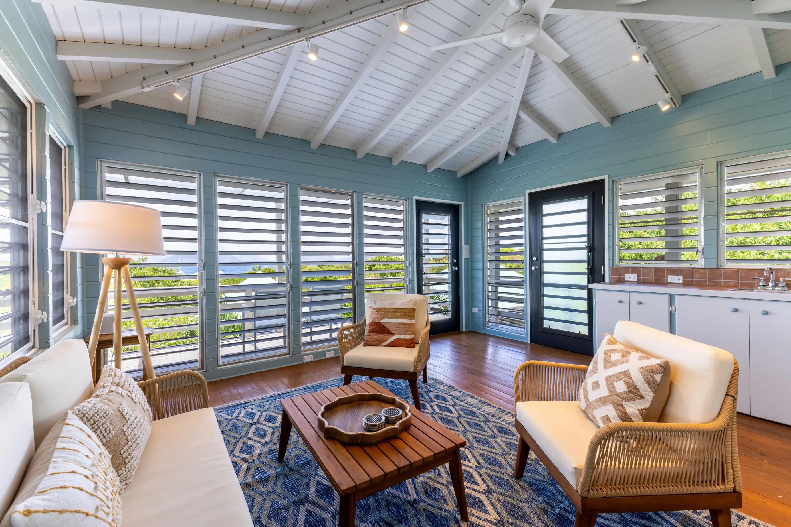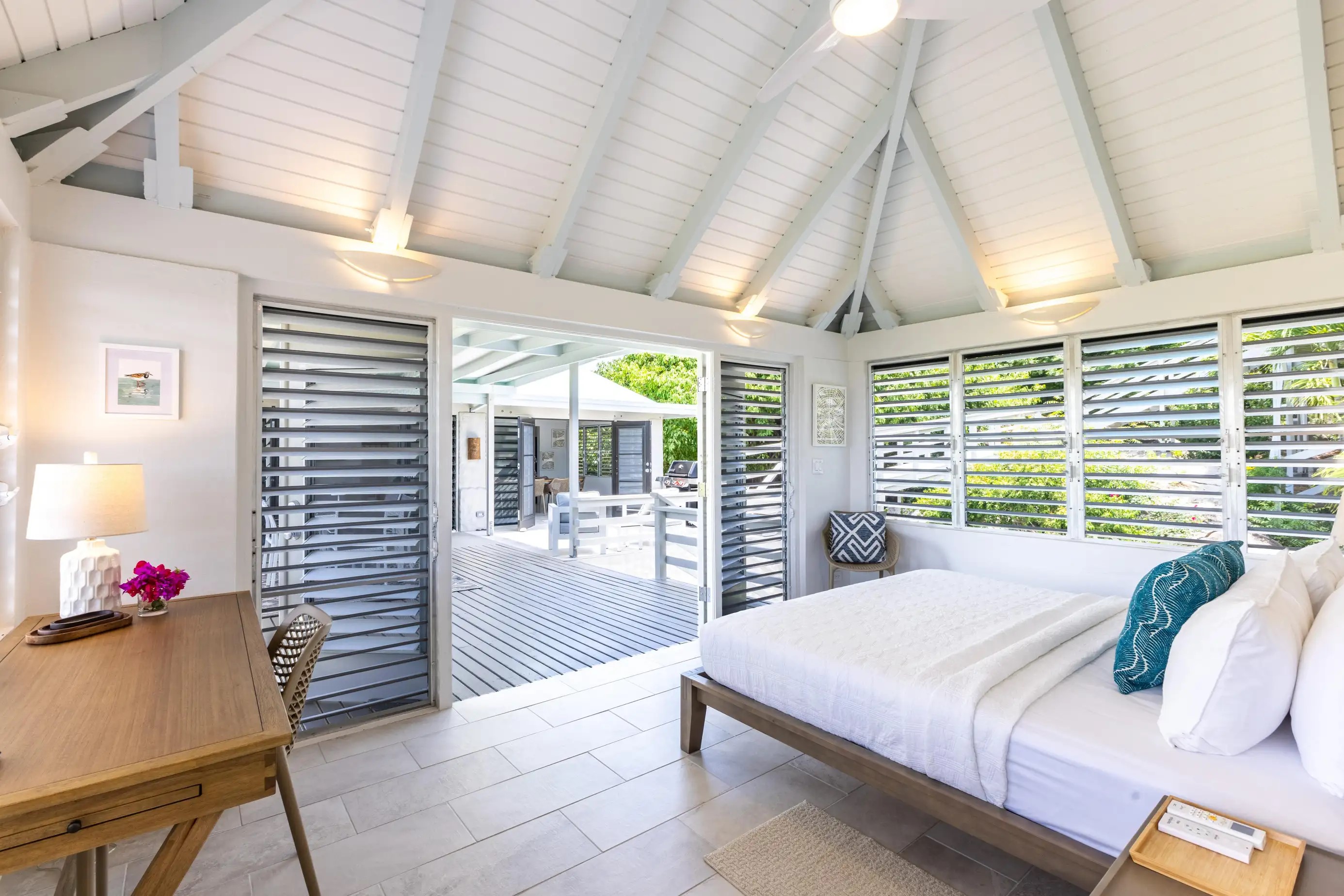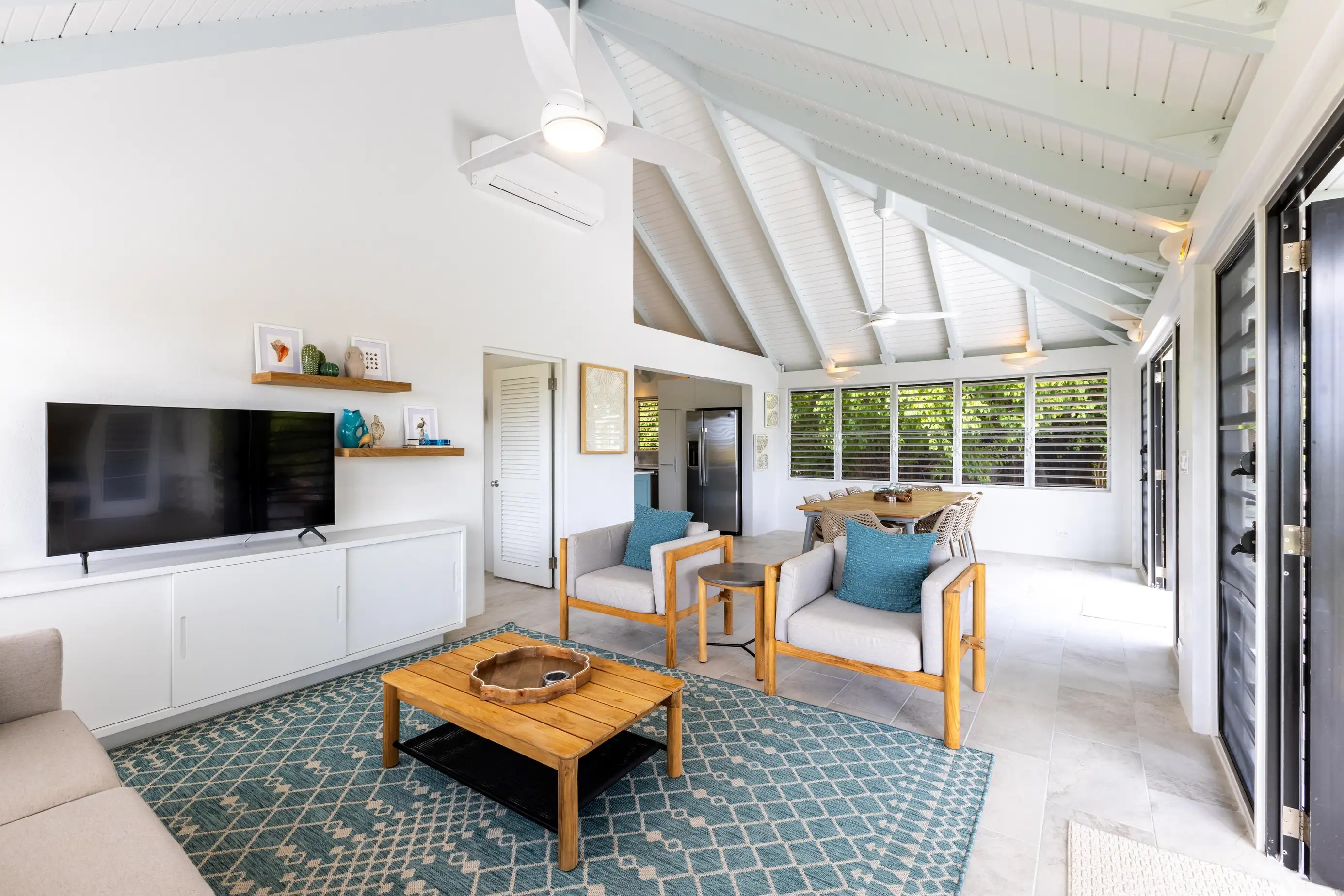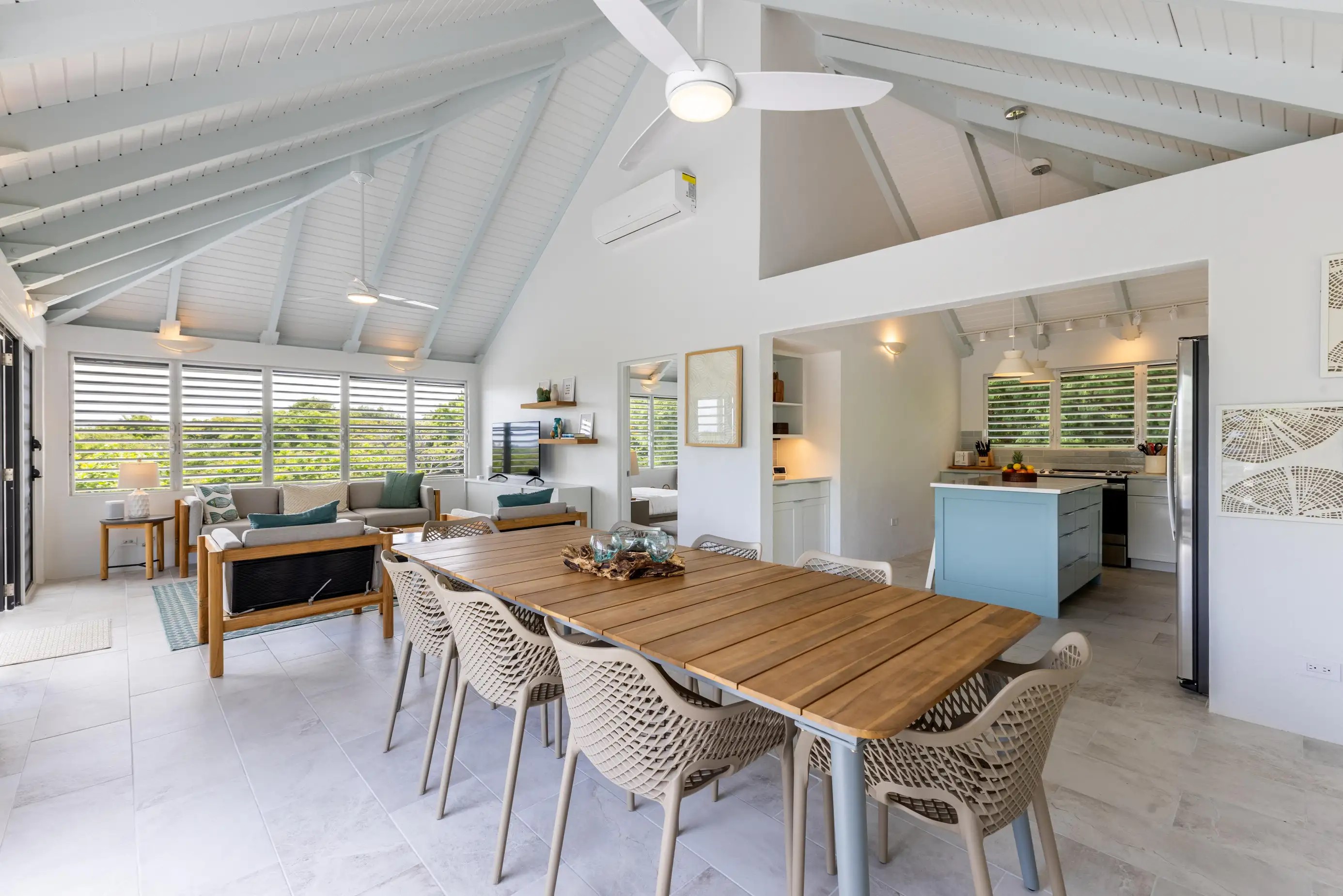 The upper living space, nicknamed “The Treehouse", this contains a second living room & second covered viewing deck. The best views of Little Trunk Bay are perfect from this spot. Why not browse the villa’s lending library, play a board game with the family, watch the sunset, or just simply stargaze!