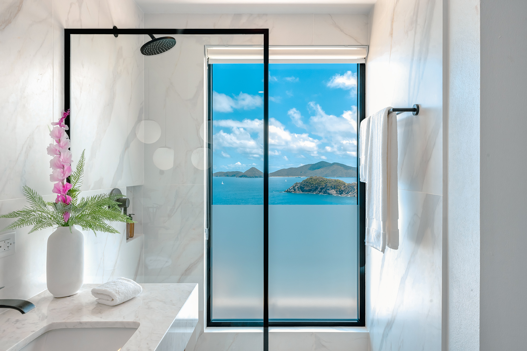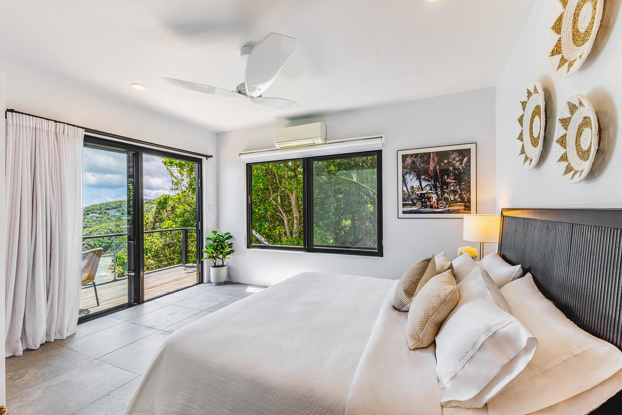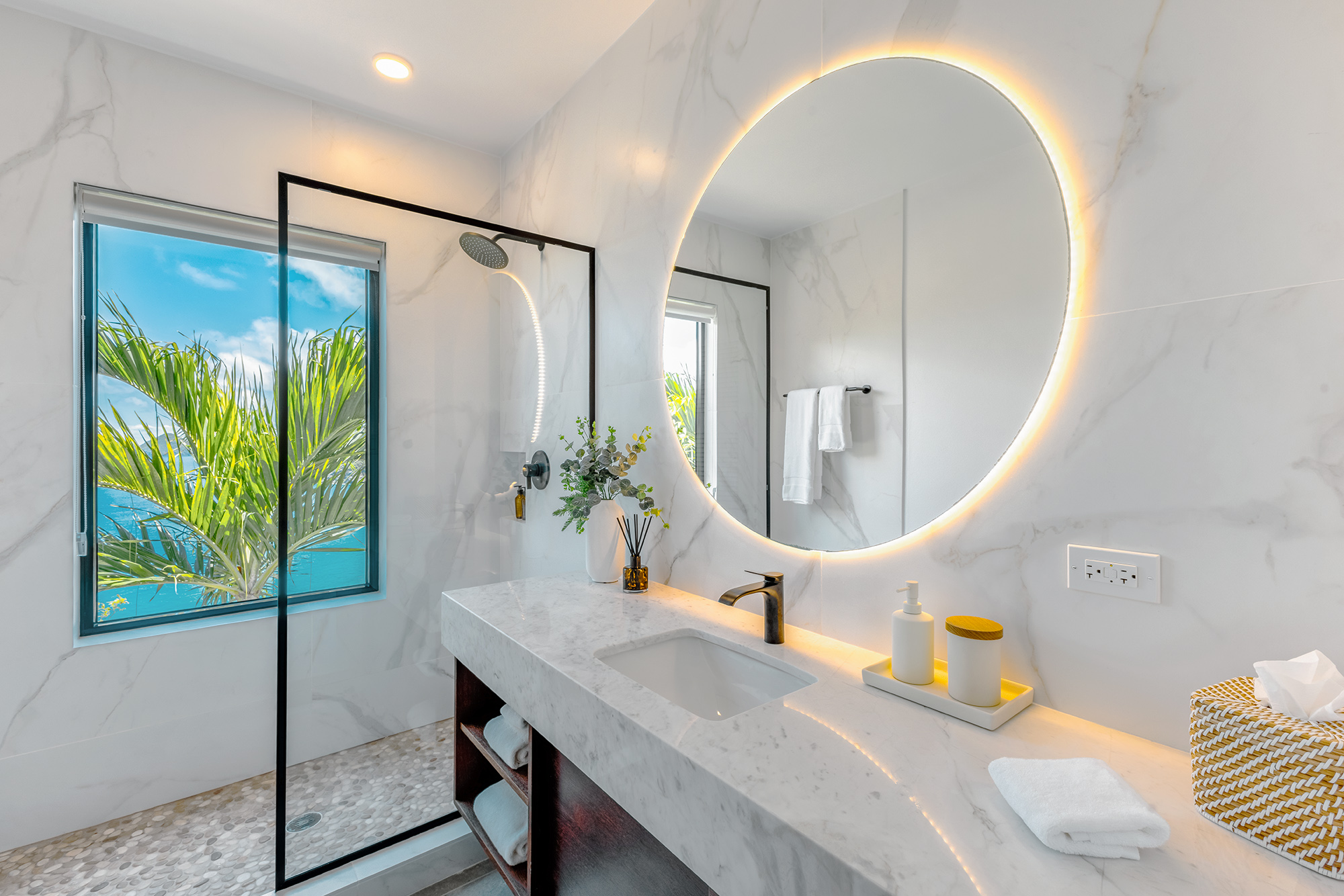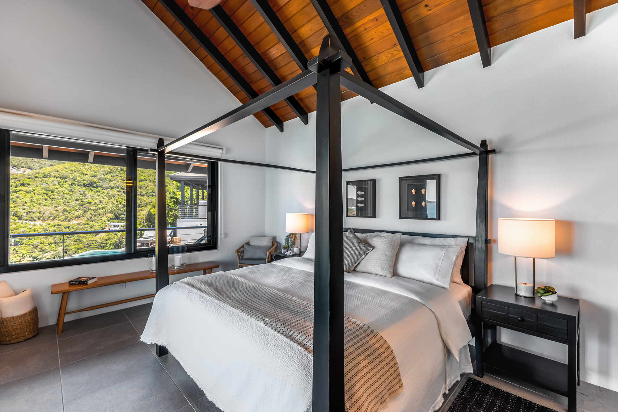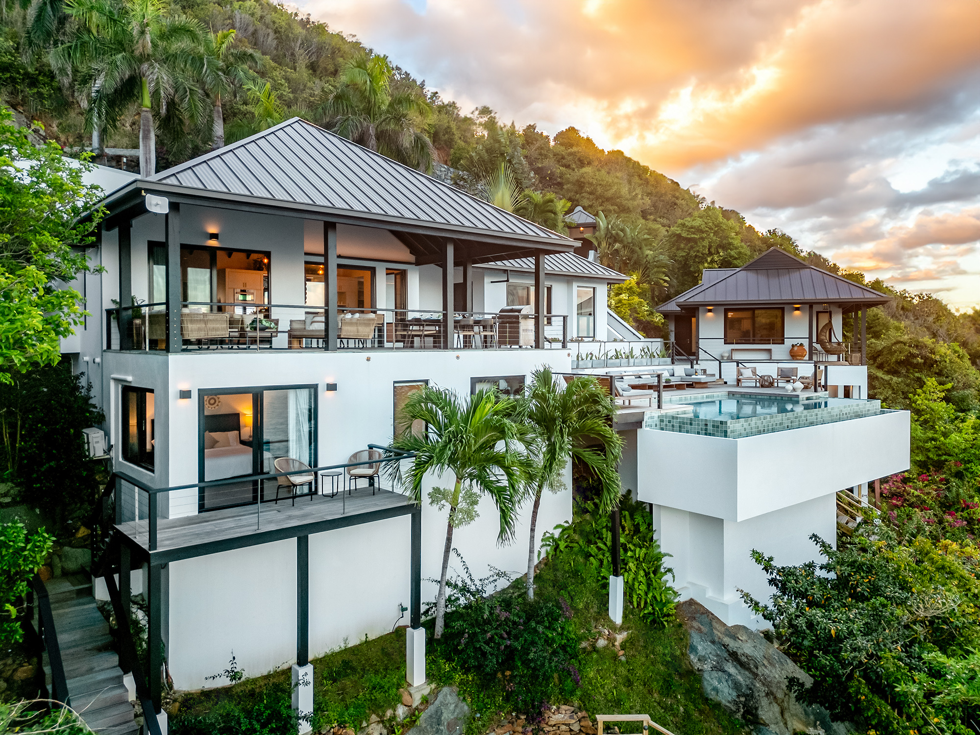 The first Bedroom is a short walk from the main entertainment area & offers a lovely bedroom bathroom suite. Across the walkway to the other side of the pool in a separate pavilion is the second bedroom bathroom suite. Both bedrooms with their contemporary style make for a peaceful setting to relax after a day out & about on Tortola. Bedroom 3 is just next door & on the lower level sits the fourth bedroom suite. Bedroom 5 is very private bedroom suite on the lower level under the entertaining area. The balconies in the bedroom suites offer a lovely way to bring the outside in!