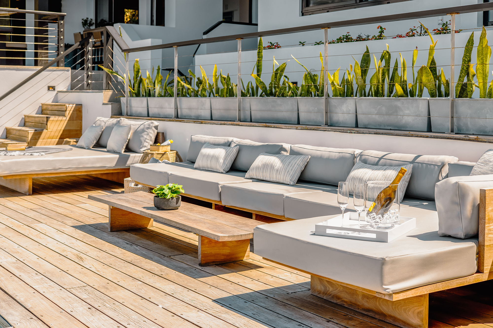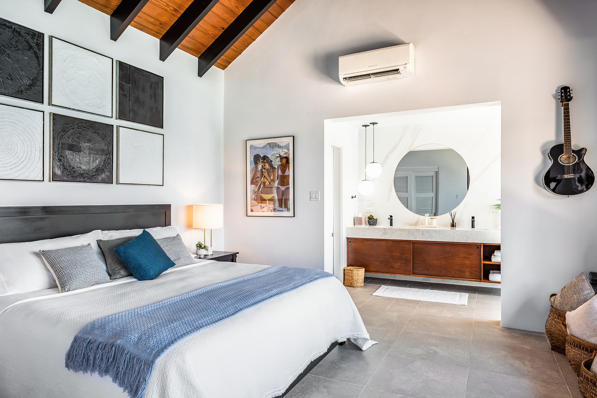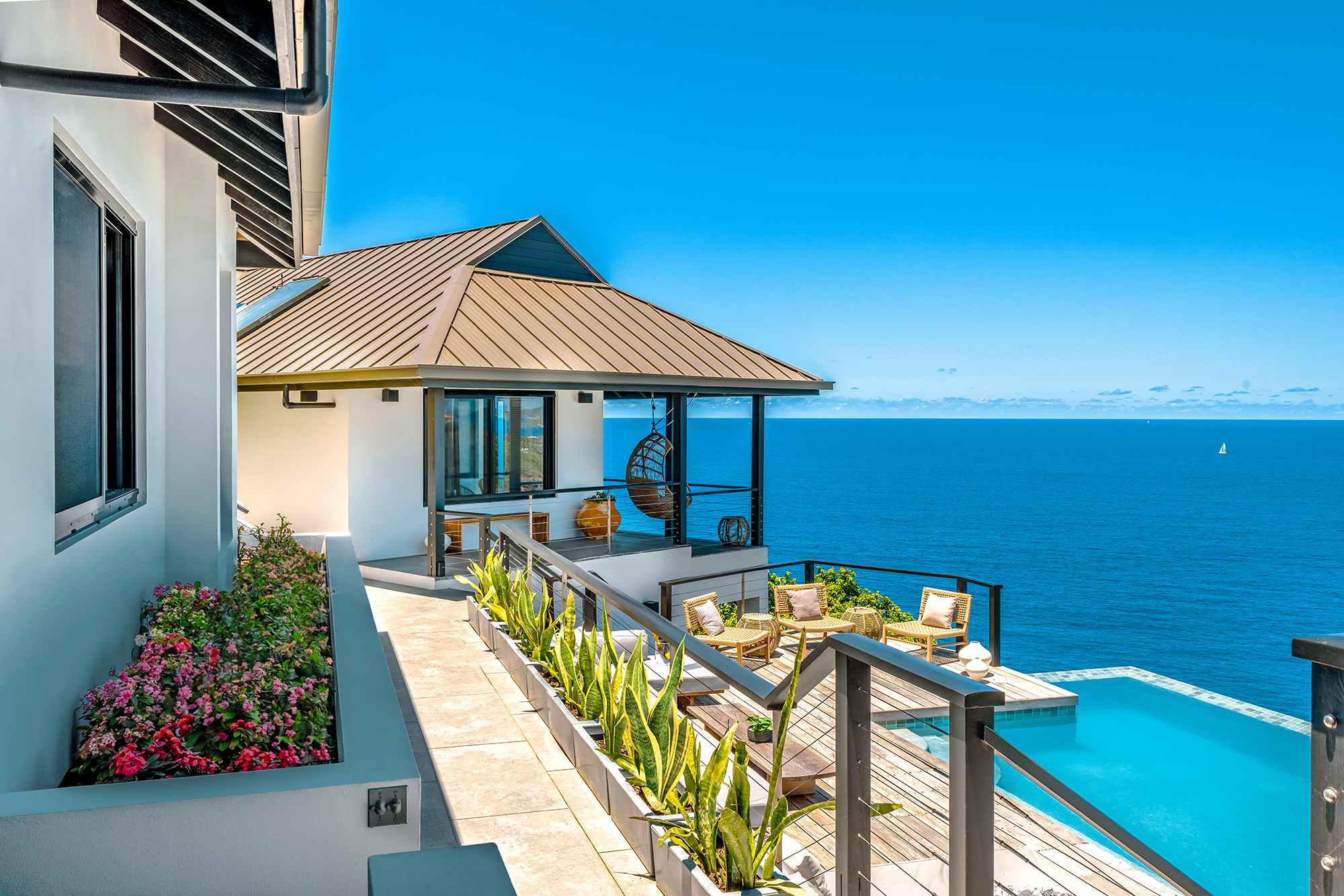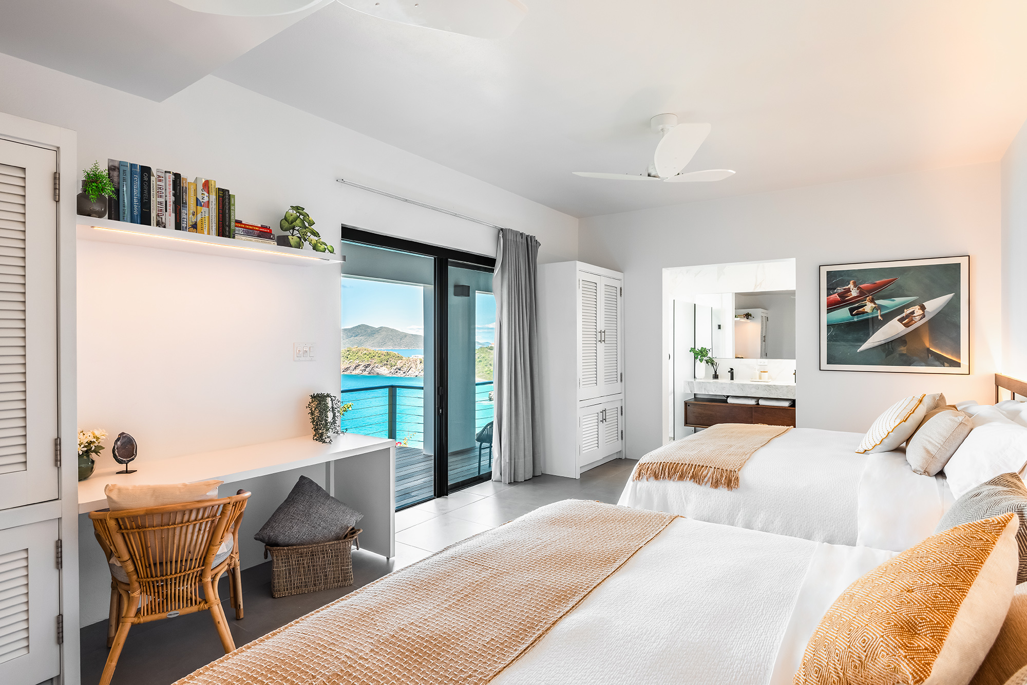 Aja’s outside space welcomes you with extensive tropical landscaping. Magnificent views as you look across Trunk Bay & onward to the chain of islands from Guana through to Necker. To the right of the pool deck sits the living, dining & kitchen areas which you enter through a large outdoor entertaining veranda offering welcome shade from the midday sun. Well-appointed day beds & spectacular sea views await at Aja villa!
