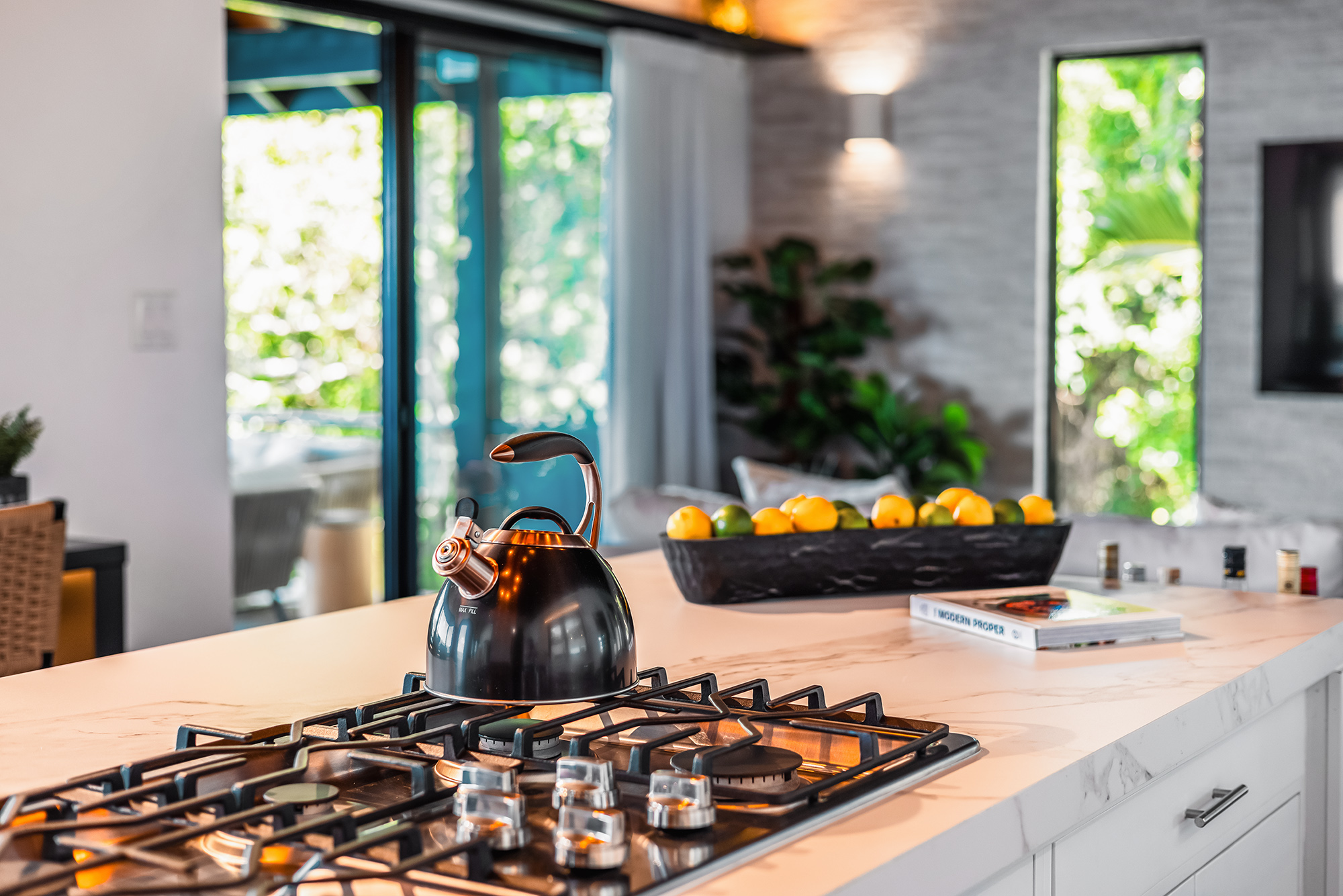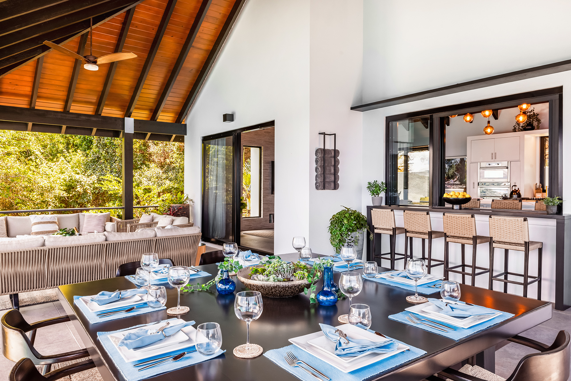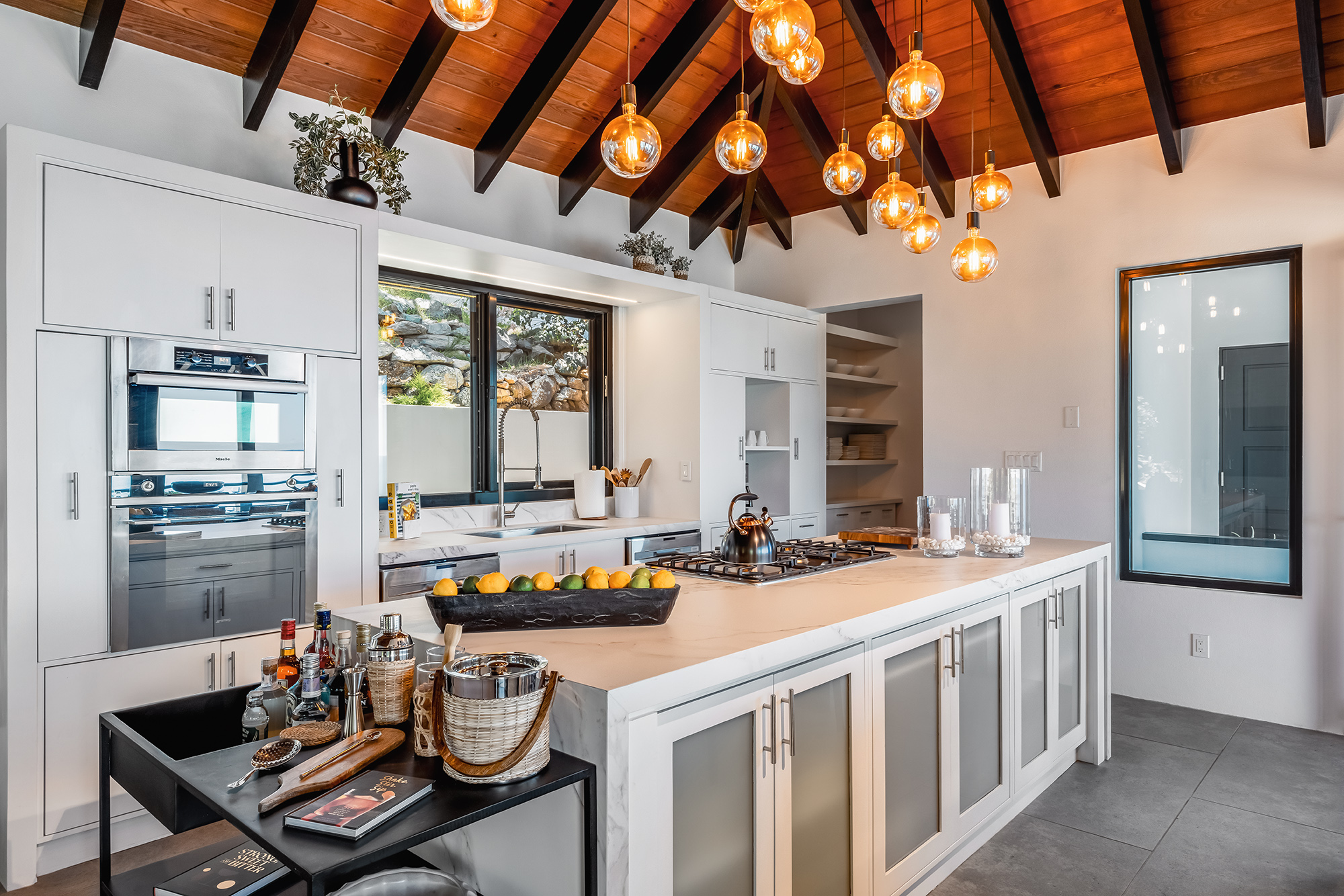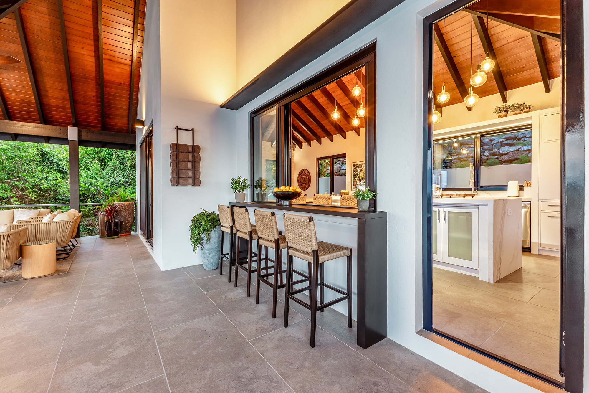 The living area is built for entertainment with a 58″ Samsung TV, indoor & outdoor music system can be enjoyed from the ample seating throughout. The whole side wall slides open, tempting you outside to the cool breezes & the spectacular backdrop of the ocean & lush hills.