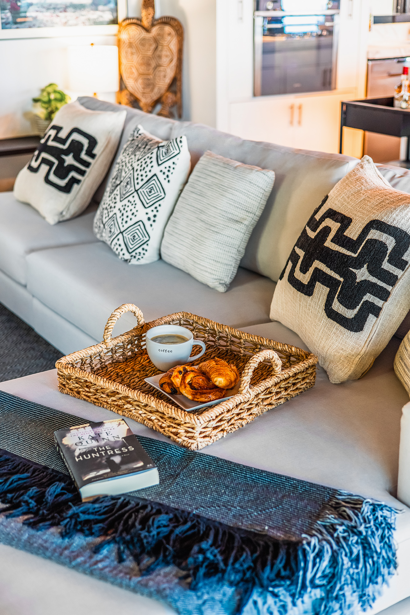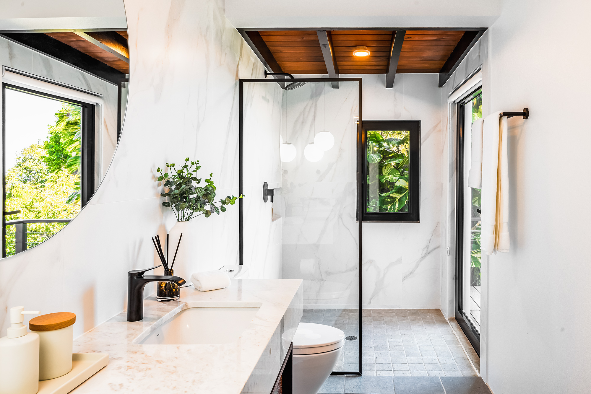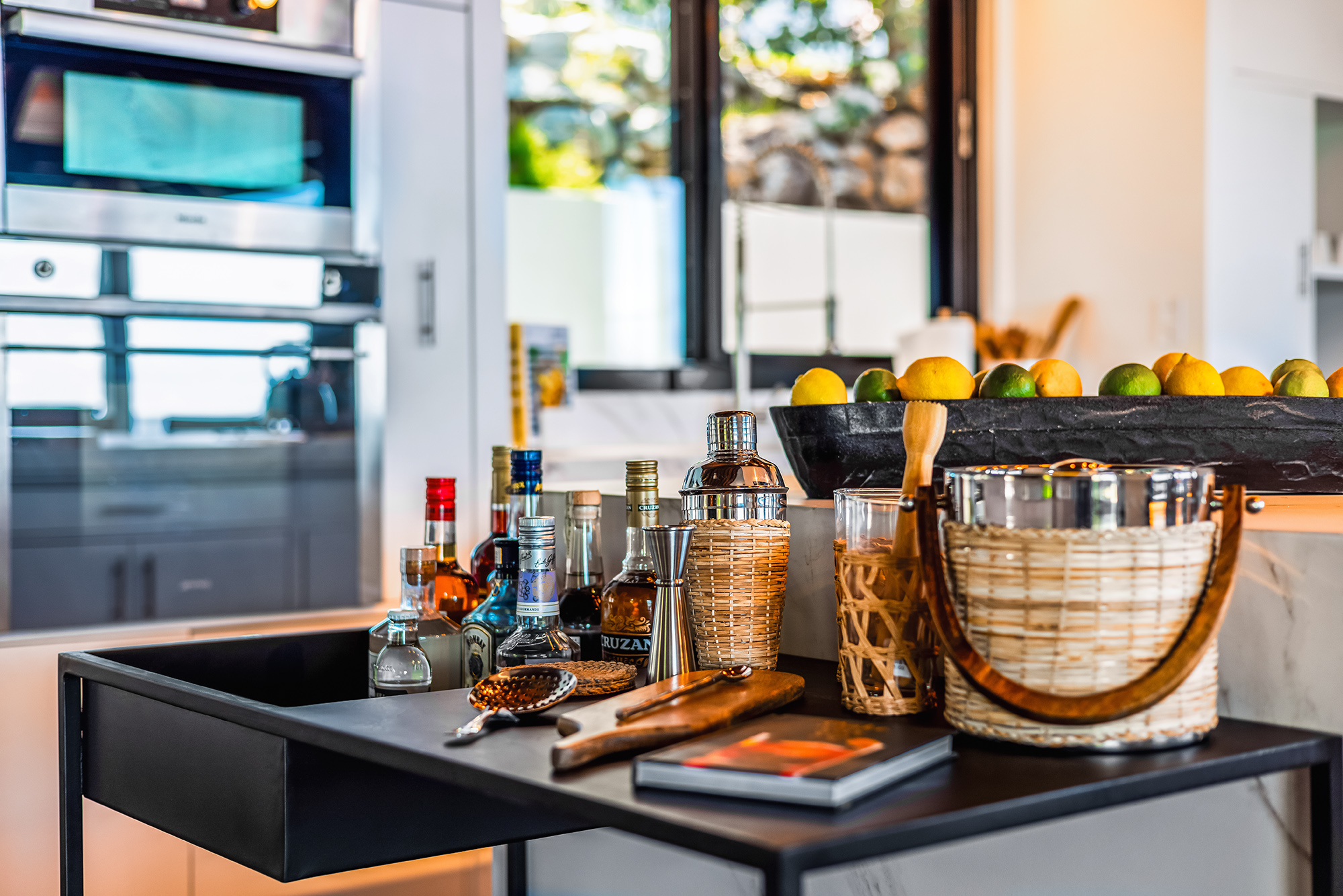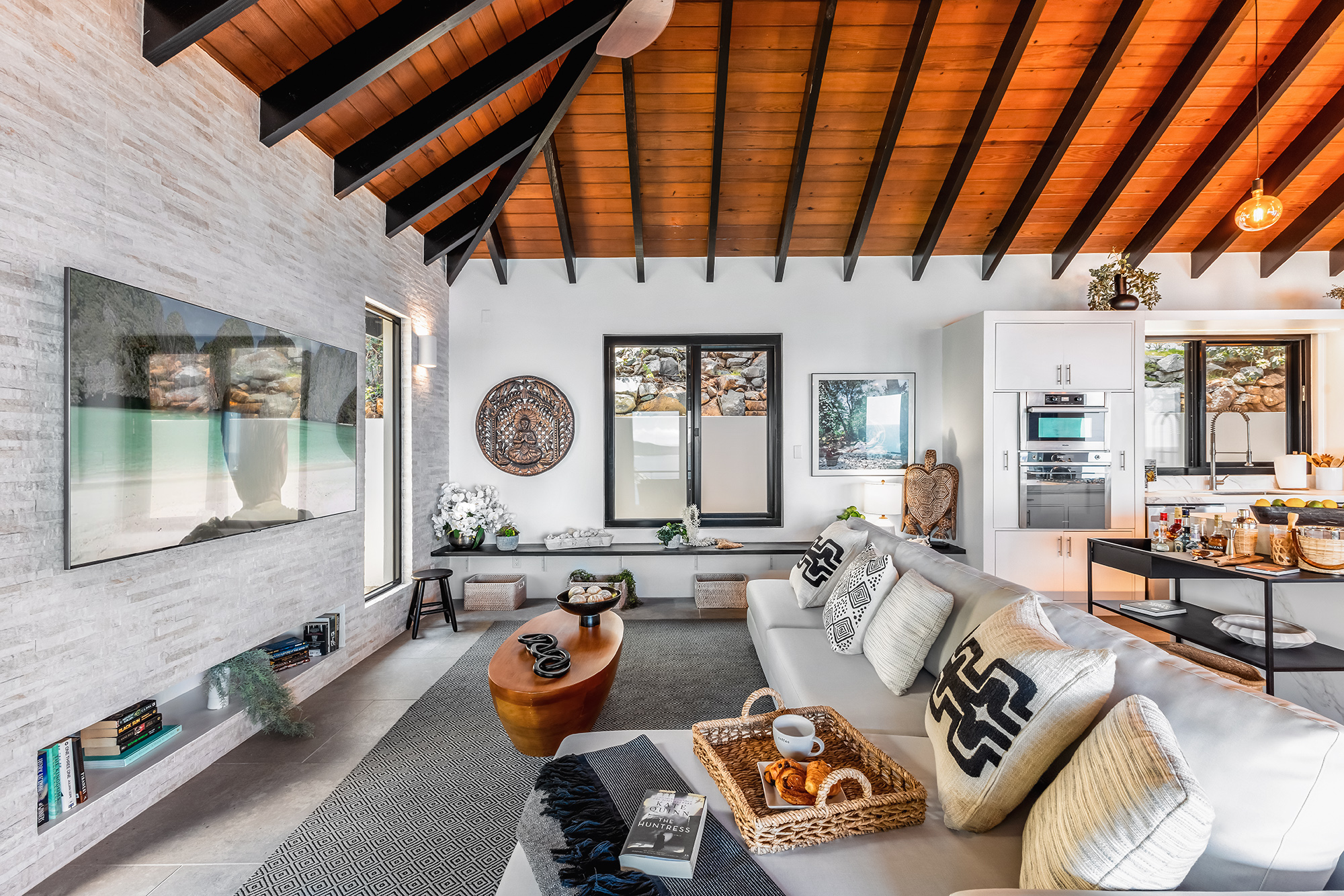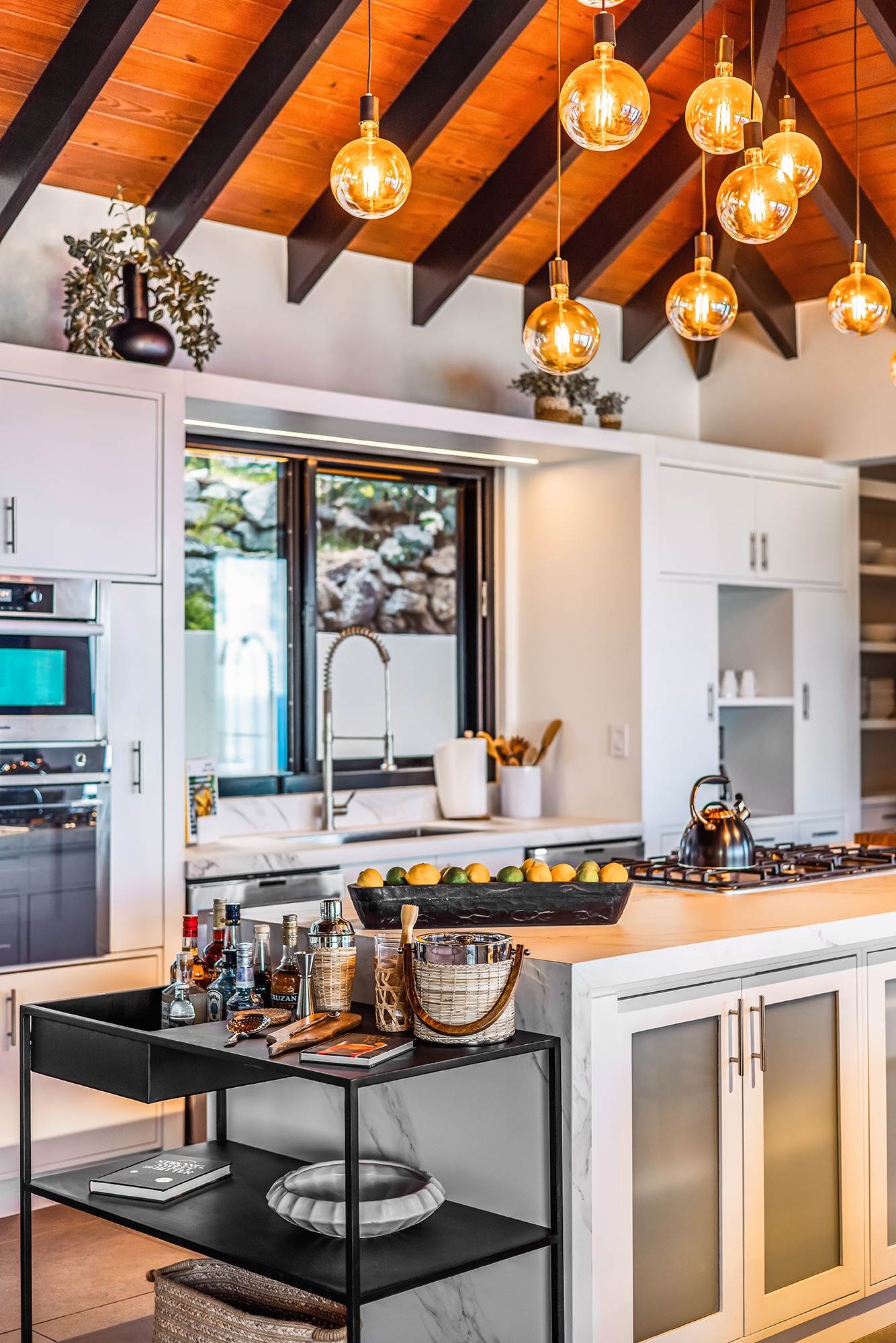 The living area is built for entertainment with a 58″ Samsung TV, indoor & outdoor music system can be enjoyed from the ample seating throughout. The whole side wall slides open, tempting you outside to the cool breezes & the spectacular backdrop of the ocean & lush hills.