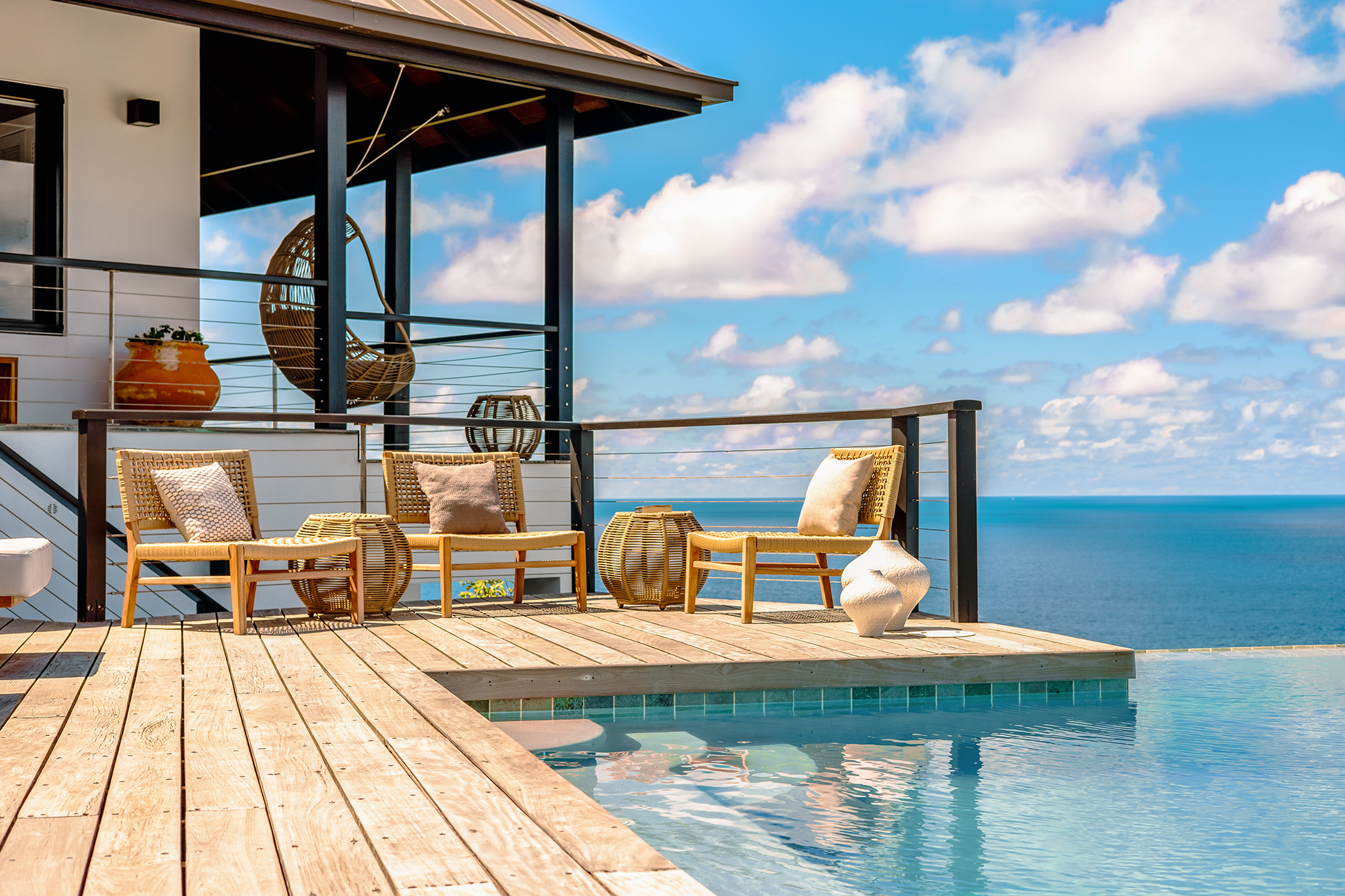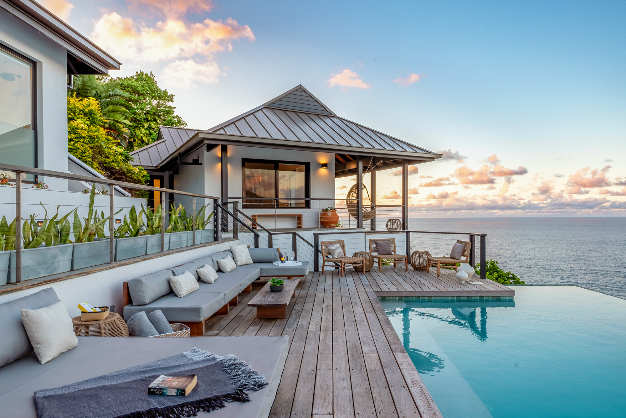 There are two pavilions connected by a central walkway to the infinity pool. This 5-bedroom property with 4 King size beds & twin beds allow your party the perfect mix of bedrooms for family or friends. During your stay you will enjoy the Asian & Art Deco fusion combining modern furniture in an attractive Indonesian Tree-House layout.