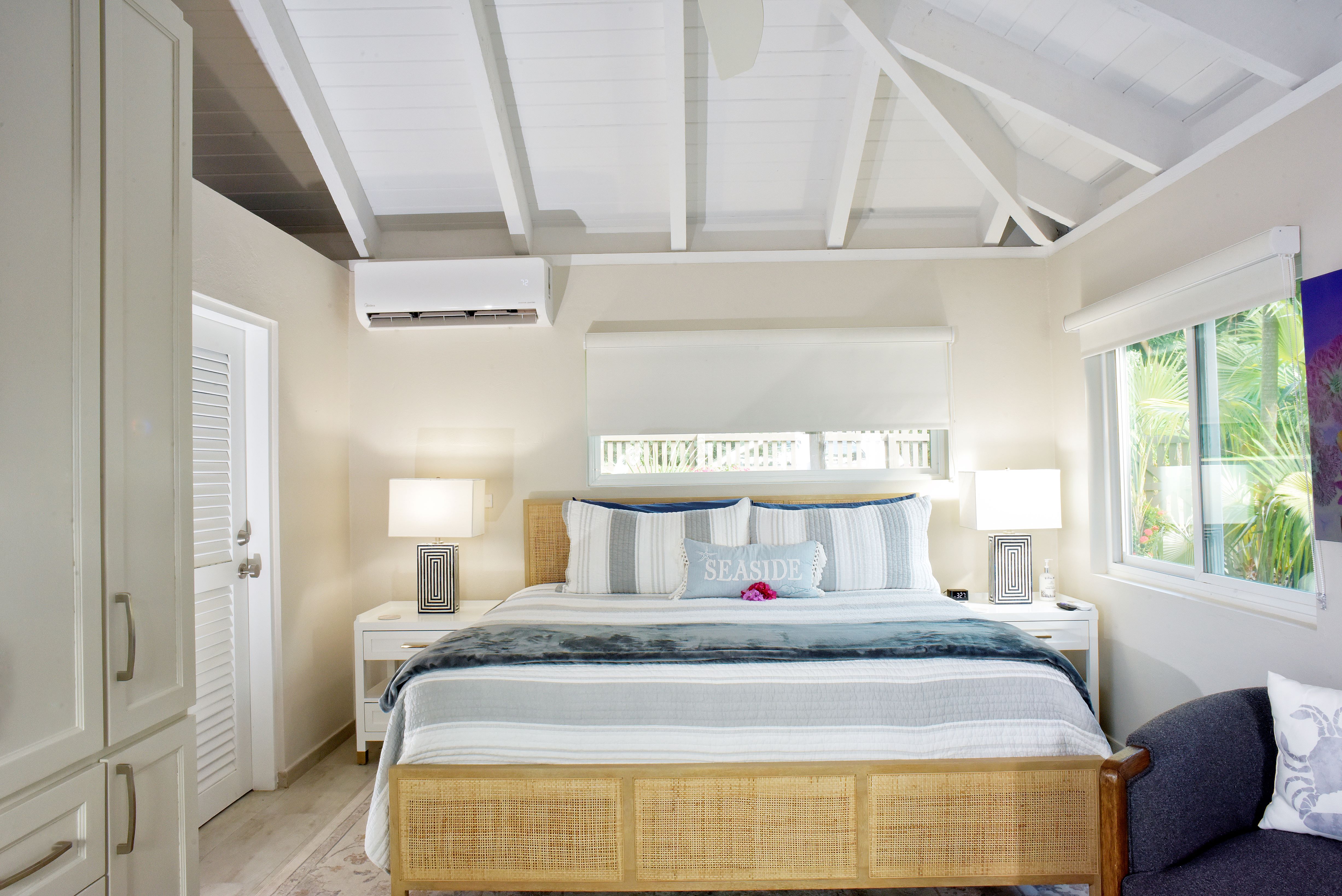 The 4 bedrooms include 2 King Beds with double vanities & outdoor showers. The 3rd King Bed with its en suite with both indoor & outdoor showers. 4th bedroom has exterior steps to 2 Twin Beds with an en suite bathroom. There is a half bath off the living room & there is a couch in one bedroom that will sleep 2 more guests.
