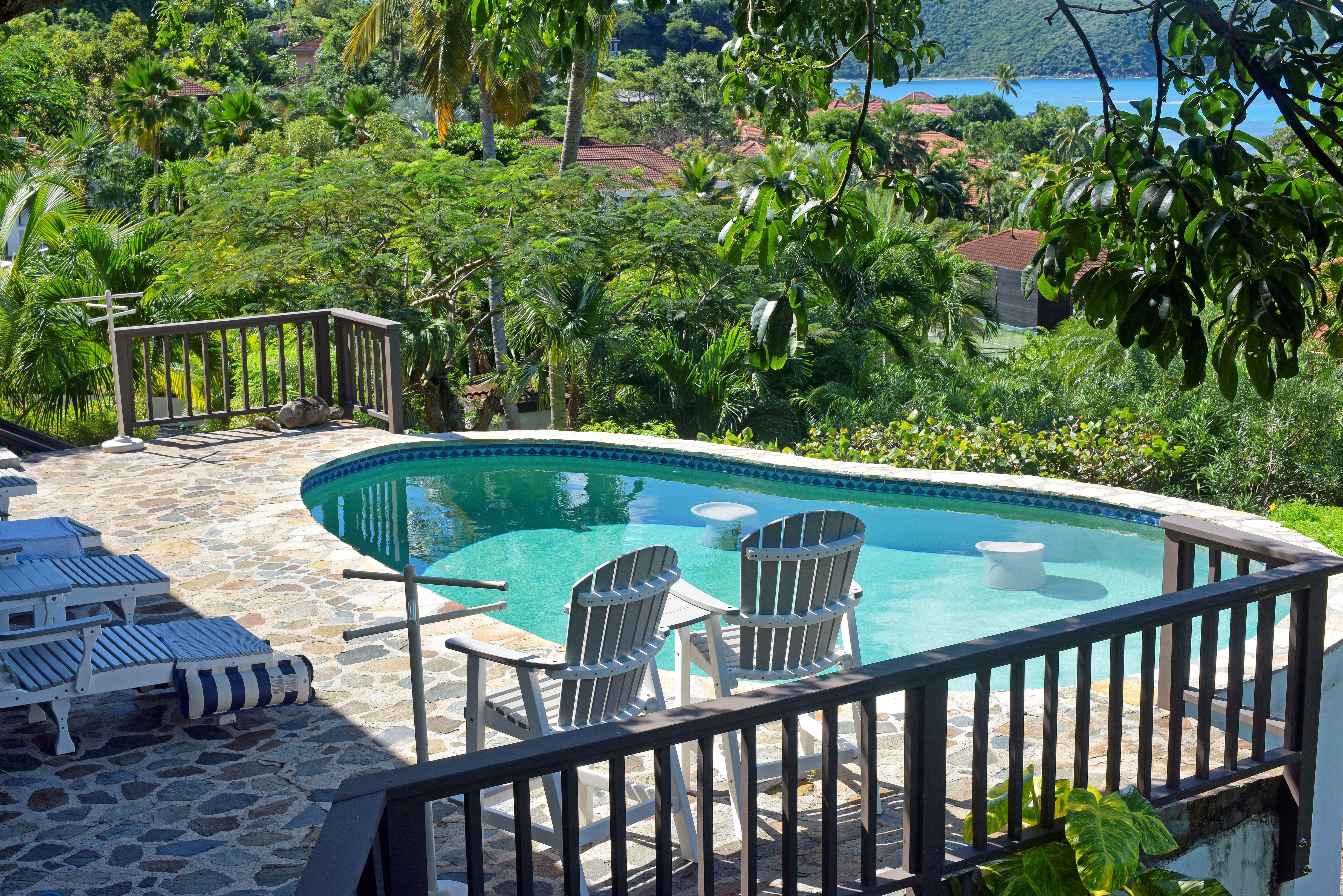 Villa del Sole recently renovated in 2025 is a wonderful villa perched in the hillside overlooking beautiful Mahoe Bay on Virgin Gorda. The lovely tropical garden in this 4-bedroom property is delightful. The Great Room makes for happy living whilst on vacation. The kitchen & dining in this villa allow for a open plan place to chat with your family or friends about the day’s events. The pool allows for a good place to chill out in the BVI breezes. At the main house there are 2 bridges which pass by a 200 year old Kapok tree. There is a self-contained apartment as well in this villa.