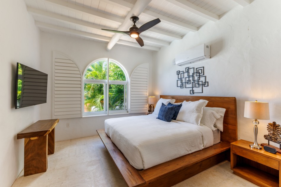 The Master bedroom suite is in the first building, which is the other side of the pool terrace to the main house. This offers a private refuge from the rest of the villa. King bed with a built-in closet, 55” TV, air conditioning or ceiling fan depending on which you prefer. The ensuite bathroom offers a stone walk-in shower & a private porch overlooking Belmont Pond & Long Bay Beach.