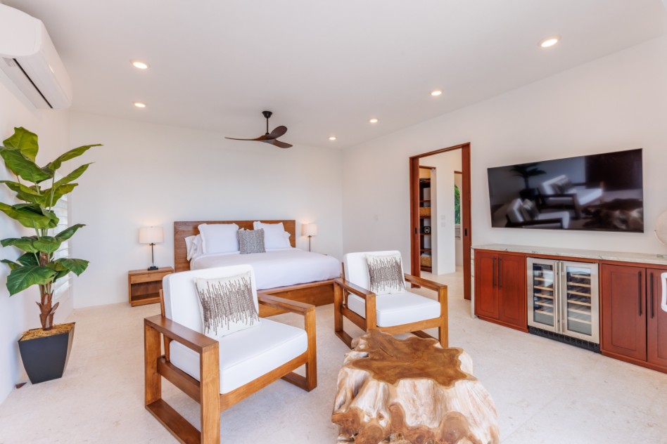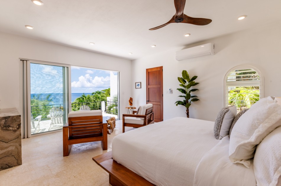 Bedroom 4, another Master perhaps in this private paradise is located a short stroll away from the main house. King bed, air conditioning or ceiling fans, large walk in closet, 65” TV) & private porch with spectacular ocean views. Coffee maker in your room! The ensuite bathroom has a lovely stone walk-in shower, bathtub, double vanity, soft light enters through a large arched window framing the magnificent views.