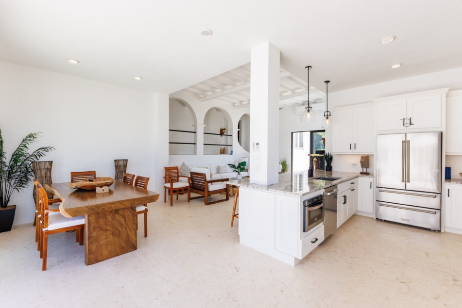 The main house drifts through from the pool terrace, with large sliding doors & open-plan living. The kitchen, dining area allows you to cook & chat with your guests. You have the choice of air conditioning or ceiling fans to keep things cool. A particular feature is the teak dining table which offers up to 8 guests for dining. The living space offers relaxing seating with beautiful ocean views! 65” TV if you fancy a little downtime from your wonderful vista.