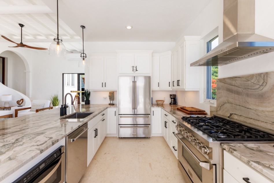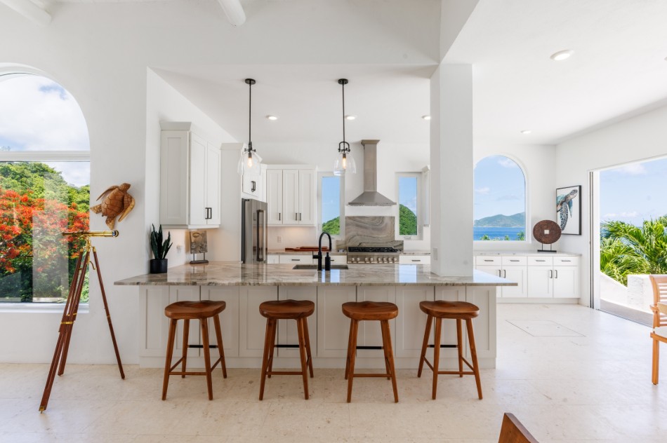 The Mediterranean style to Santorini is just perfect for the islands. A treat which is accessed by a flight of stairs behind the primary suite, you are met with a rooftop terrace with fire pit & stunning views out to Jost Van Dyke. The pool terrace is a great place to hang out, it combines comfort & style in equal measures. Sun loungers around the pool, allow you to relax & enjoy the islands breezes or take a dip in the pool if you are enjoy the sun rays (chargeable to heat the pool upon request). Alfresco dining under the stars or some light lunch maybe. Pool deck has a handy shower, half bathroom & a small deck with a gas BBQ. Ice maker, beach chairs & other essentials are available. Tropical planting throughout.