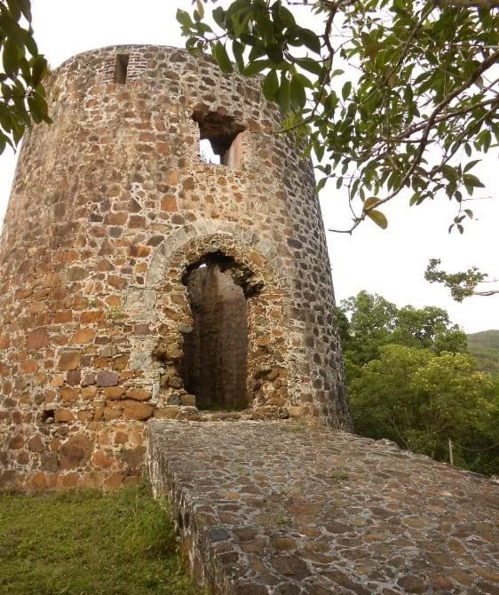 This 18th century windmill was once used for grinding the sugarcane, farmed from the steep slopes on the north shore of Tortola. It was part of a thriving 250-acre plantation where enslaved Africans cultivated the sugarcane on the terraced slopes and processed it into sugar, which was then shipped to Britain for sale. Across the road from the windmill lie the ruins of the mill round, which was powered by animals, the factory with boiling house, the distiller, hospital and living quarters.